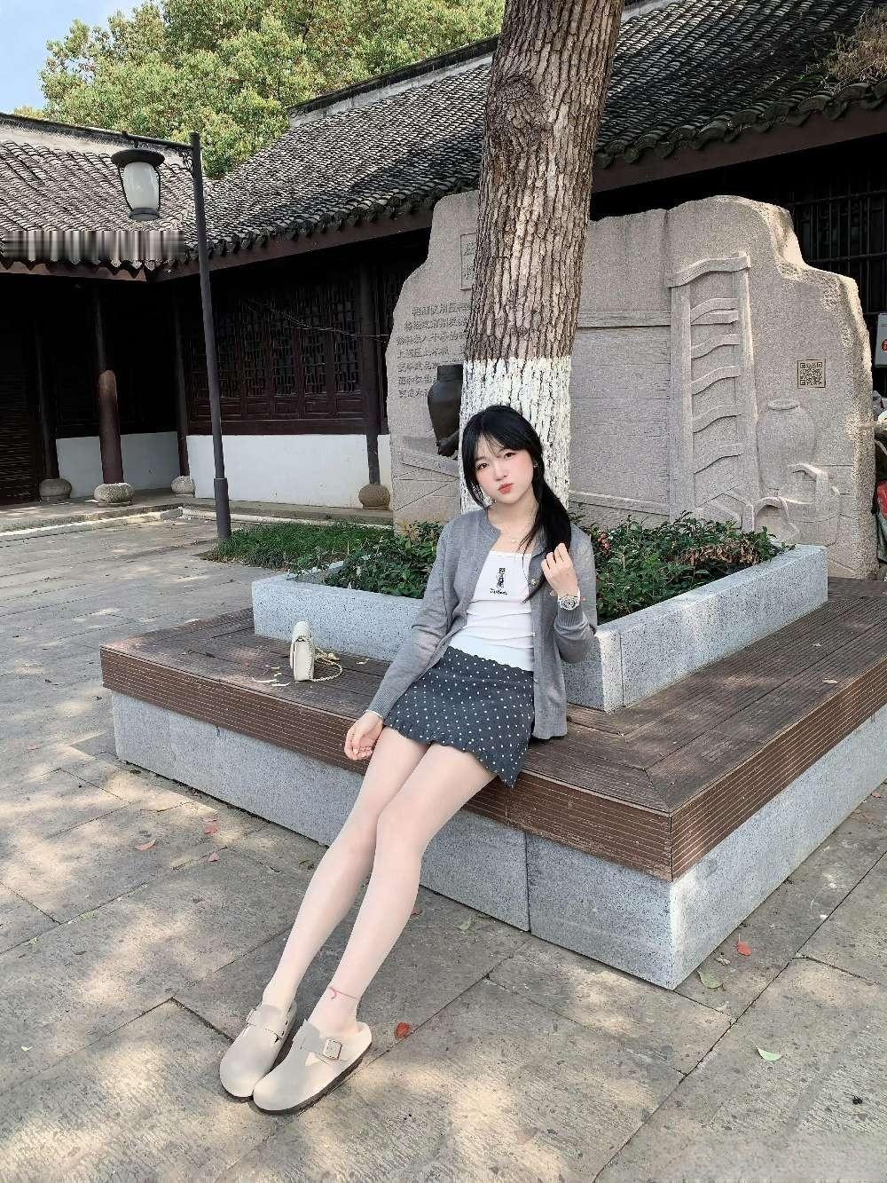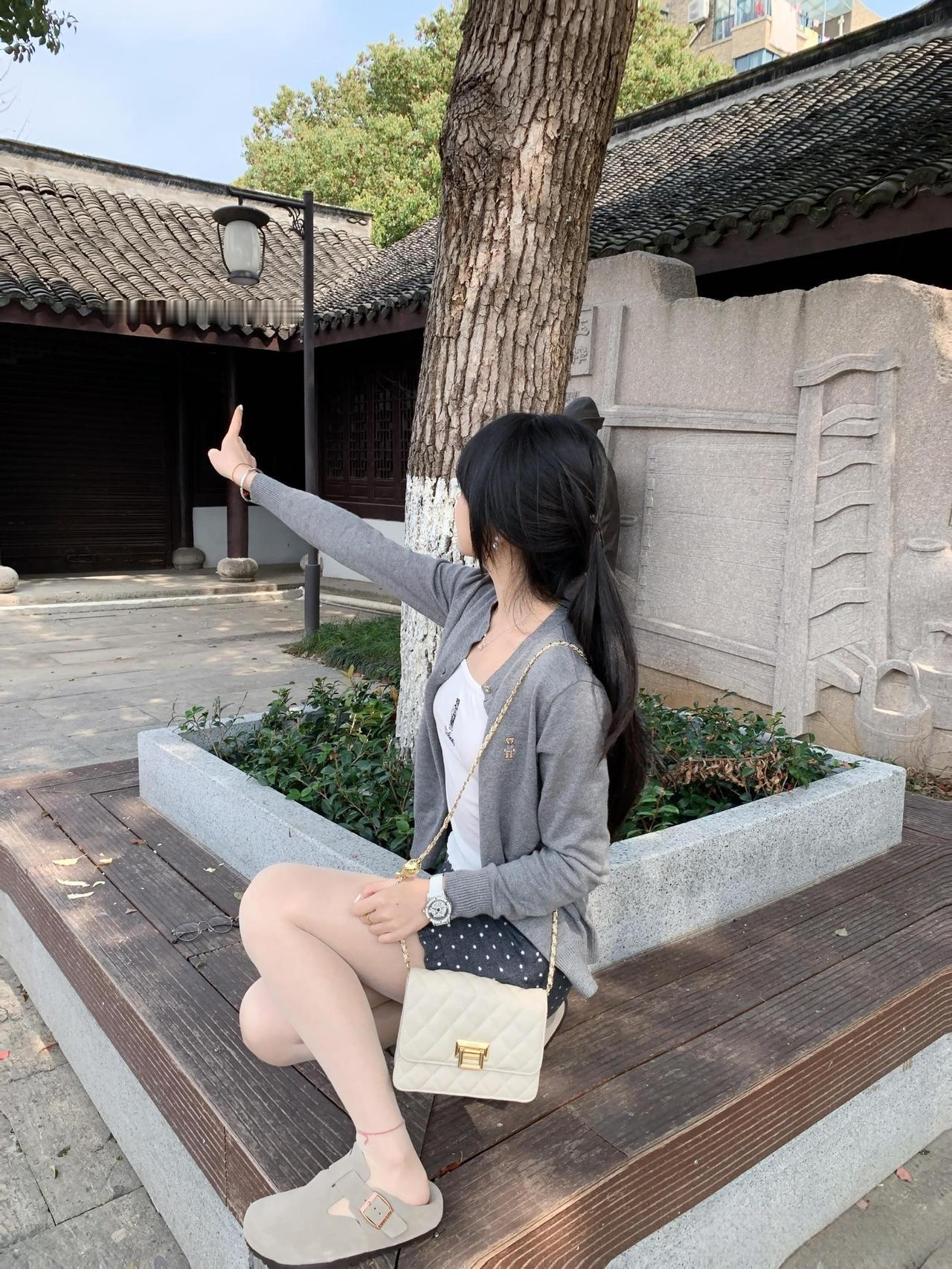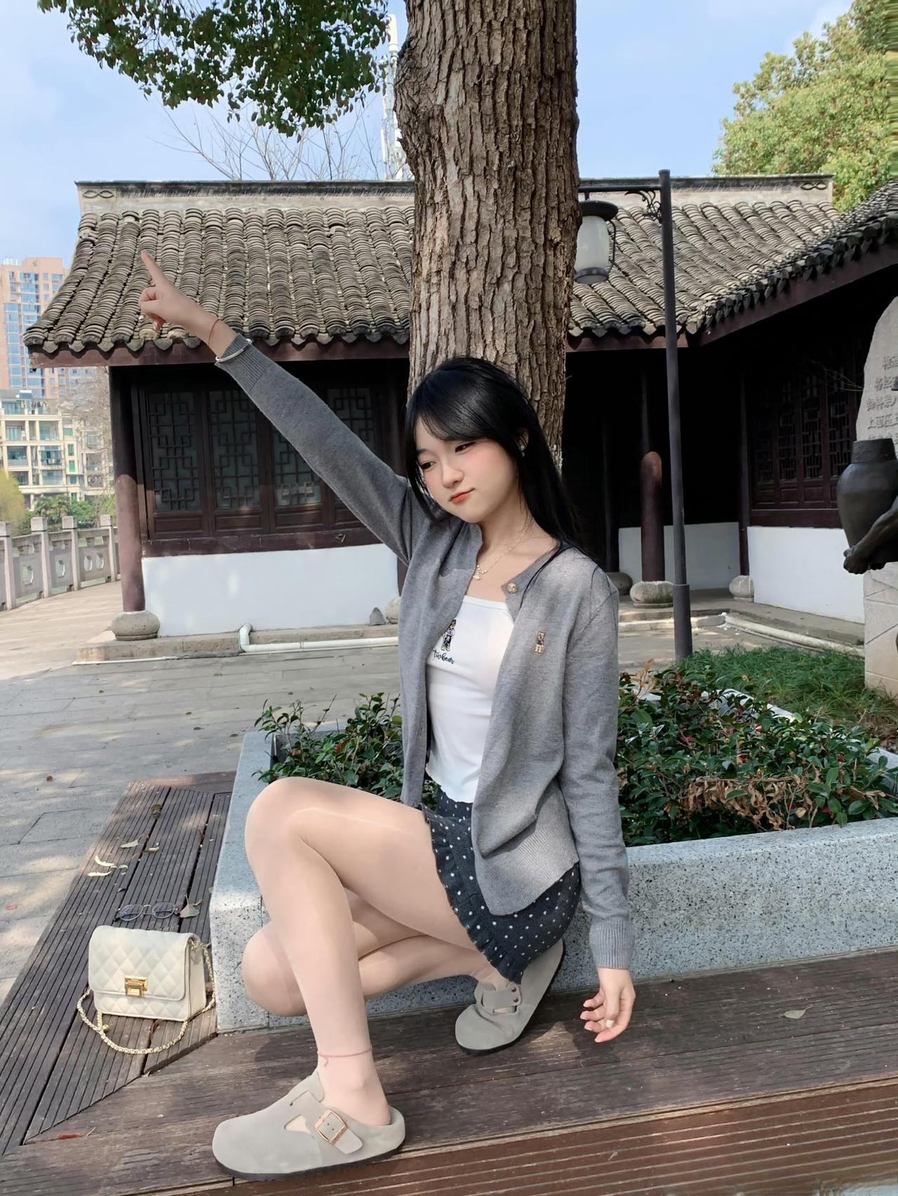 这种“浅色系针织+甜美元素下装+轻便配饰”的组合,很适合公园、中式庭院等休闲打卡,舒服又清新。