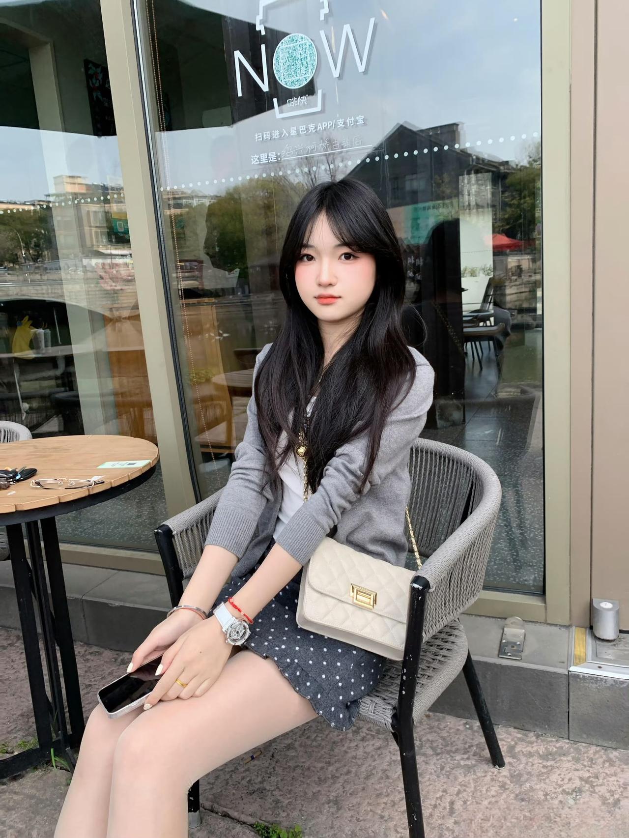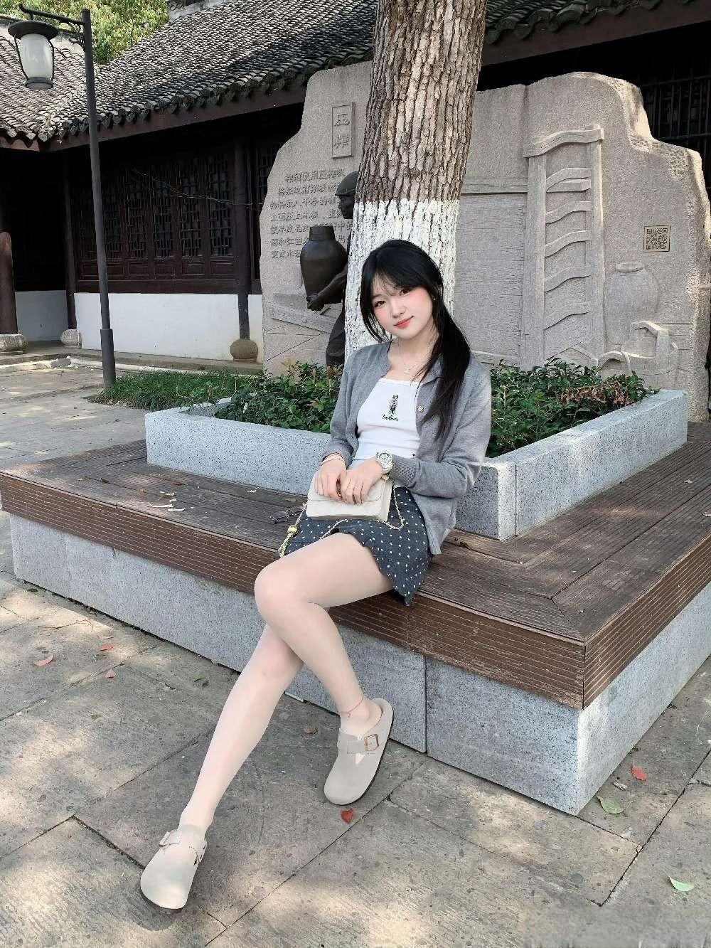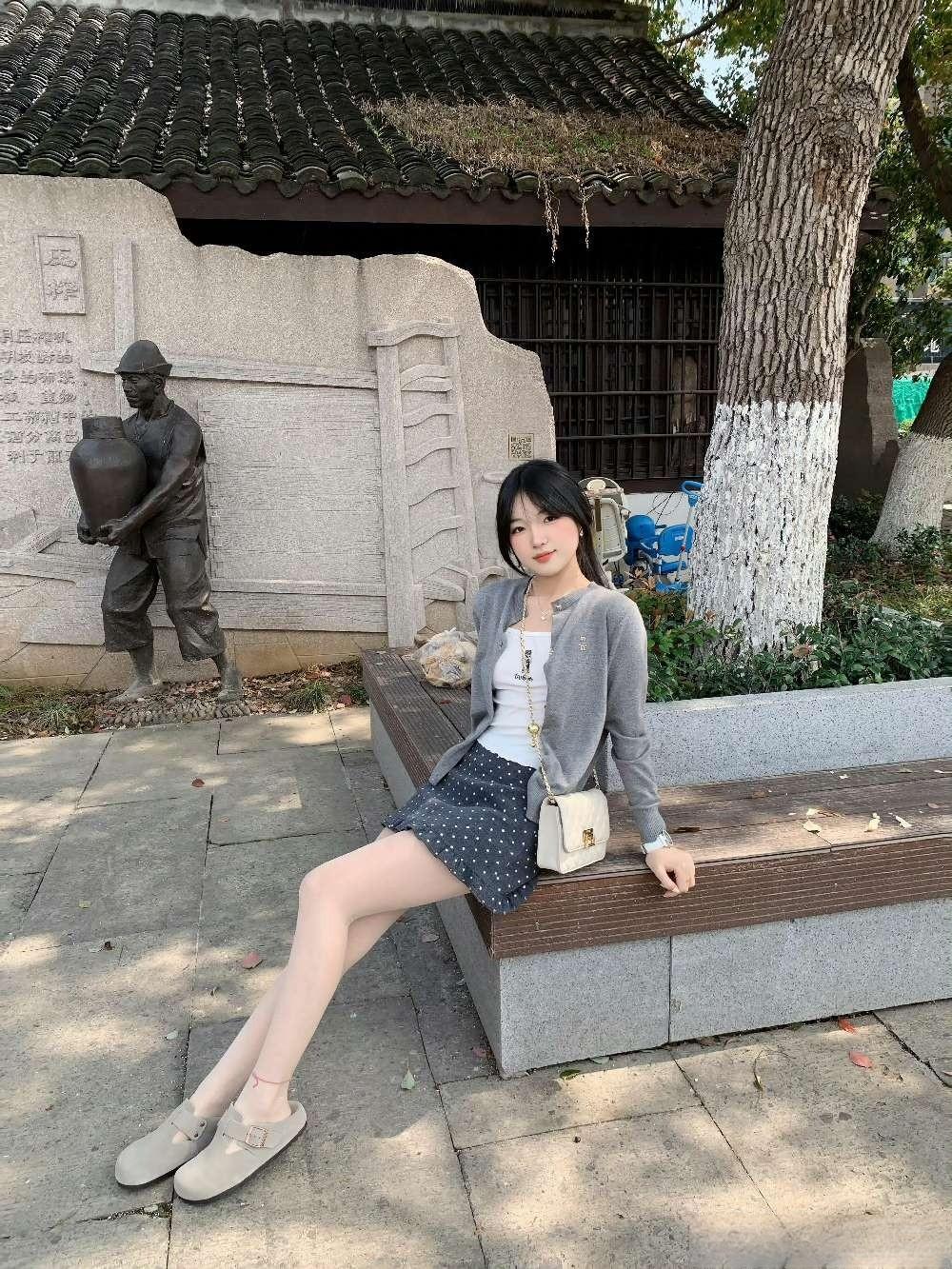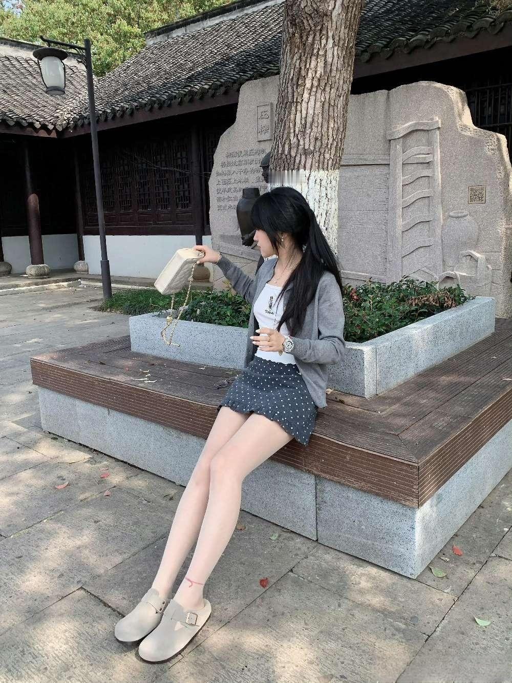 这种“浅色系针织+甜美元素下装+轻便配饰”的组合,很适合公园、中式庭院等休闲打卡,舒服又清新。