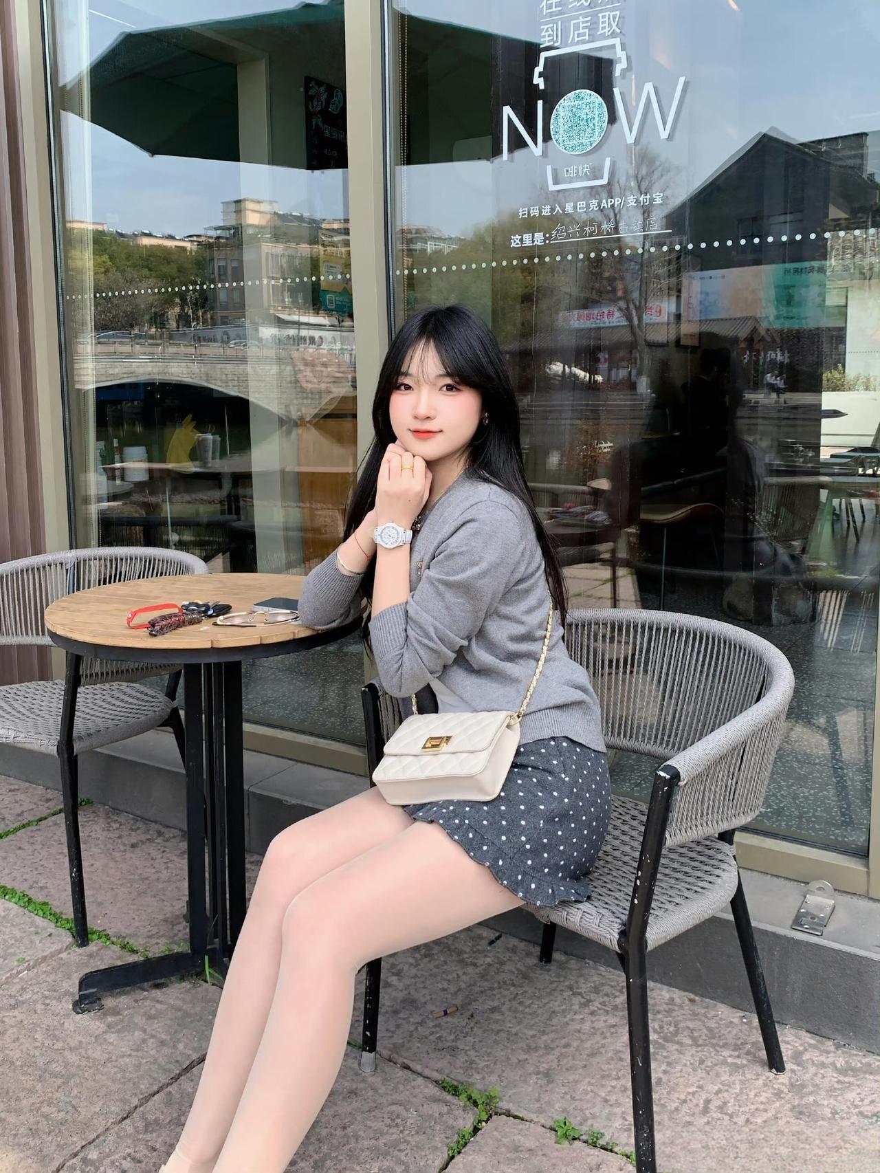 - 下装搭灰底波点短裙,波点元素带点甜美元素,和整体浅色调呼应,显腿长又和谐;