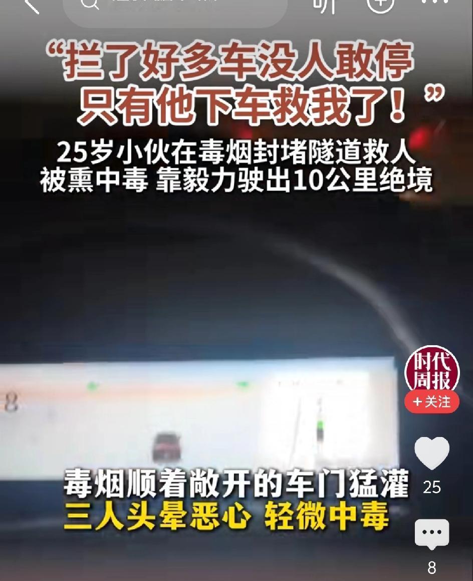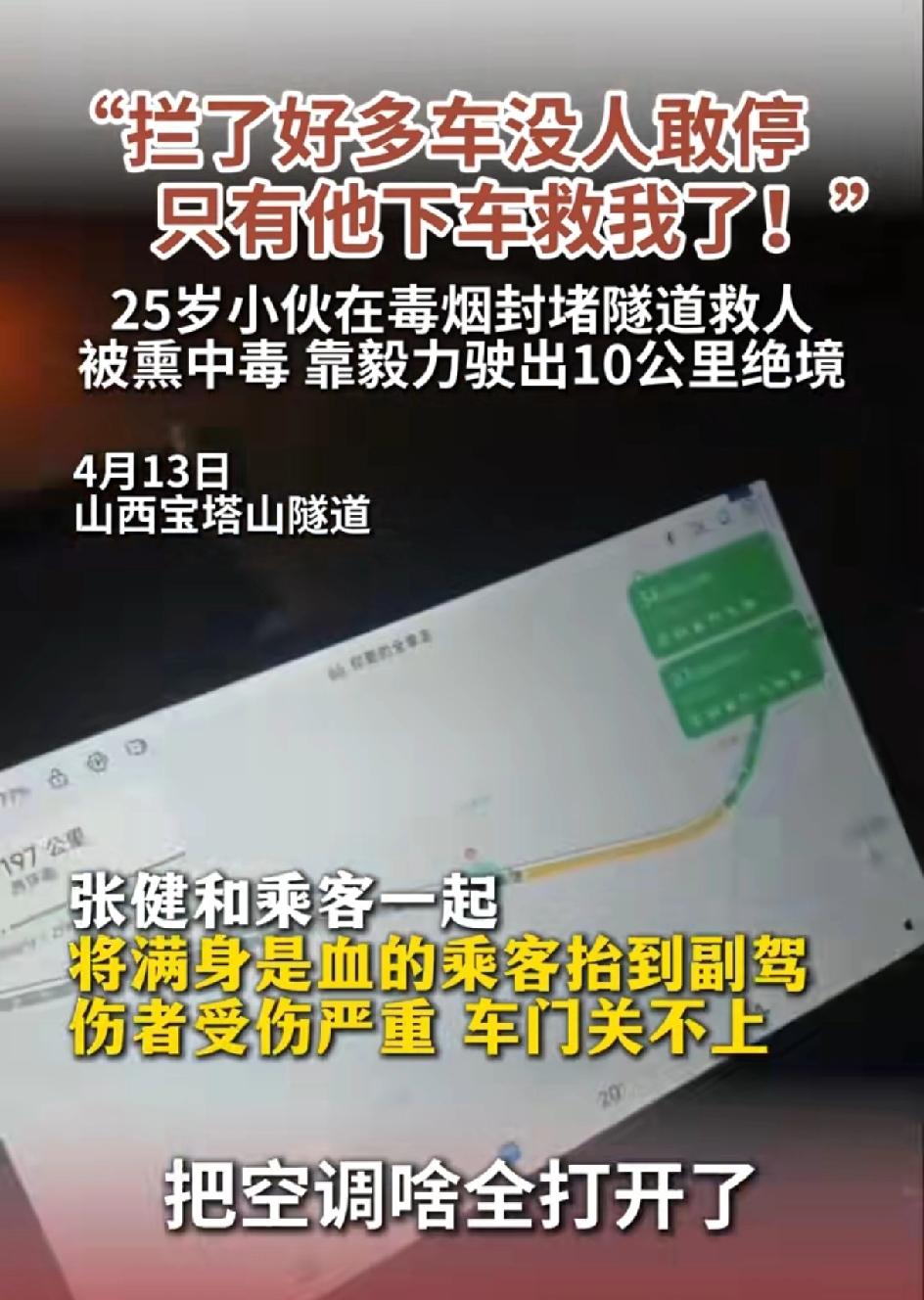 二十五岁山东菏泽曹县小伙张健,他是一名网约车司机,正好路过这个隧道。他给母亲留完遗言,隧道毒烟中逆行10km,救下因车子失火被困在驾驶室的大货车司机。