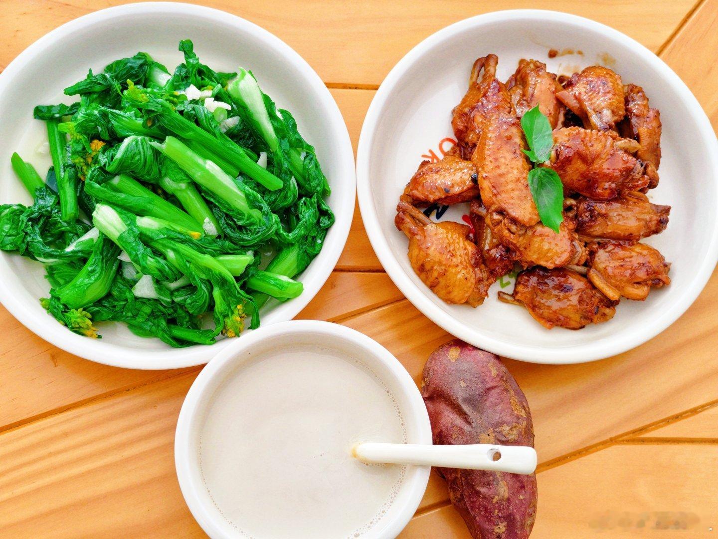 中午自己做了个减脂餐。这个份量咋样?(图二鸡翅没吃完)