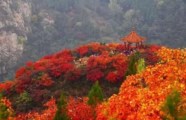 崖上彤彤锦云揽,峰尖艳艳彩林遮。