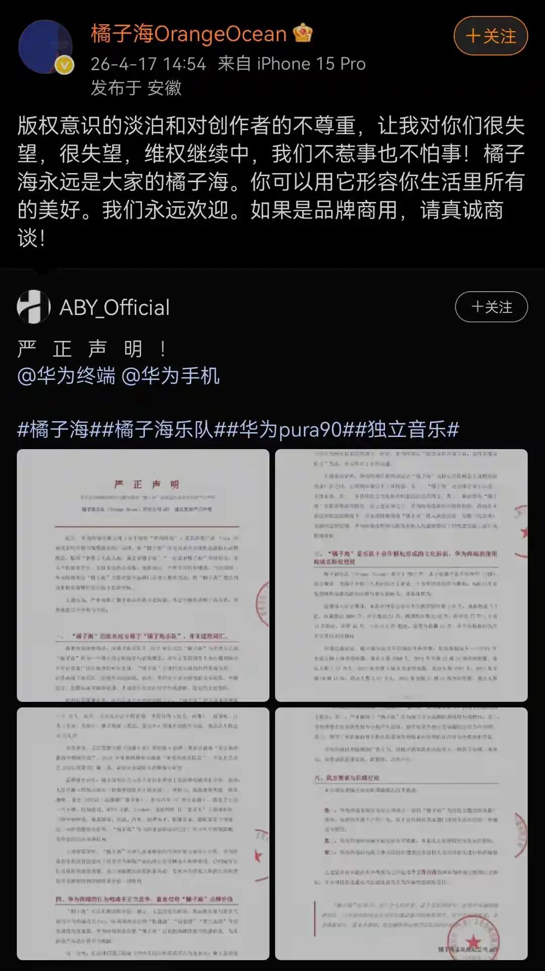 另一边,一家名不见经传的乐队,因为华为Pura90用“橘子海”作配色和宣传,便公开发“严正声明”说华为侵犯了它的权益,限华为七天之内道歉并停止侵权,还要华为赔偿他们的损失。他们一边说“橘子海永远是大家的橘子海,欢迎所有人用它形容生活的美好”,一边又发了措辞强硬的严正声明,直接点名华为终端和华为手机,指责对方“侵权、不正当竞争、蹭热度”。