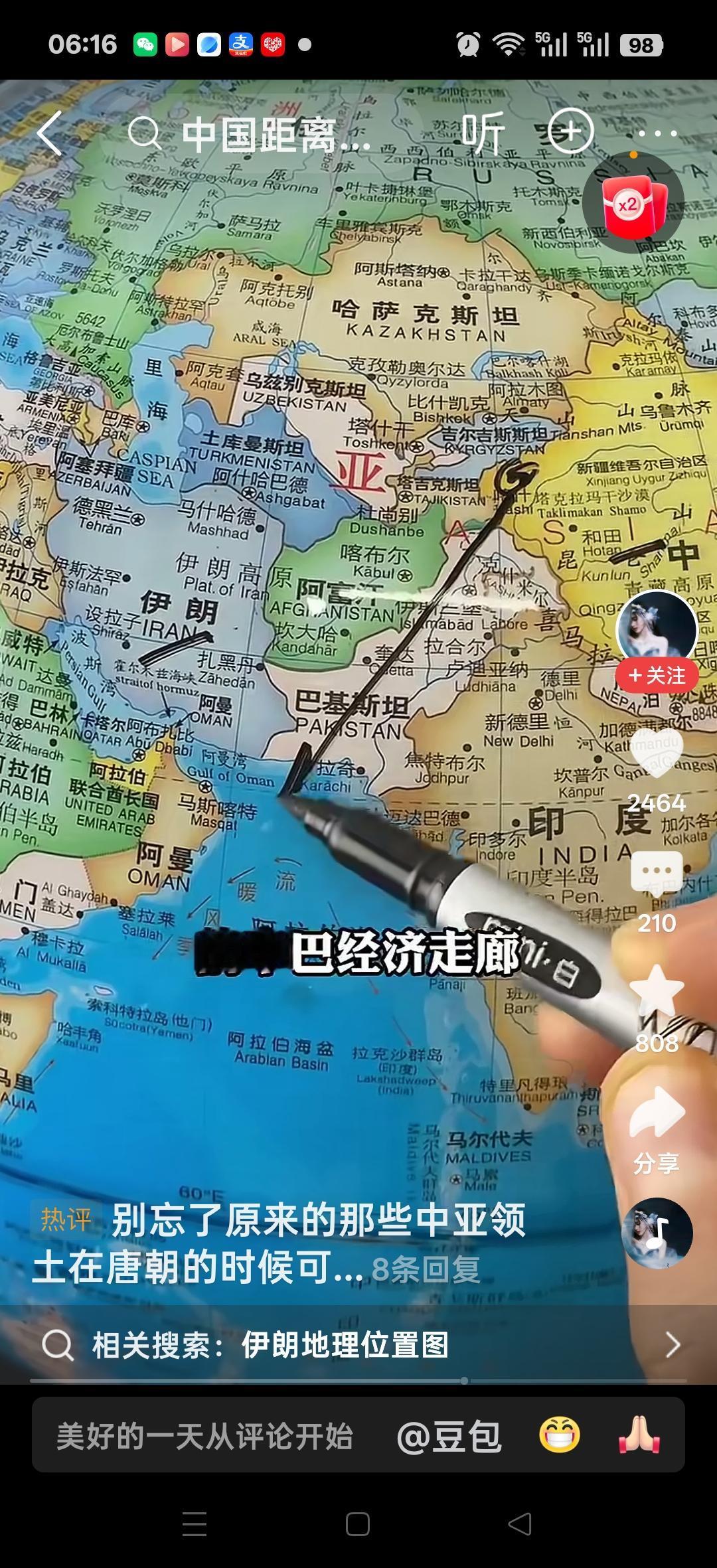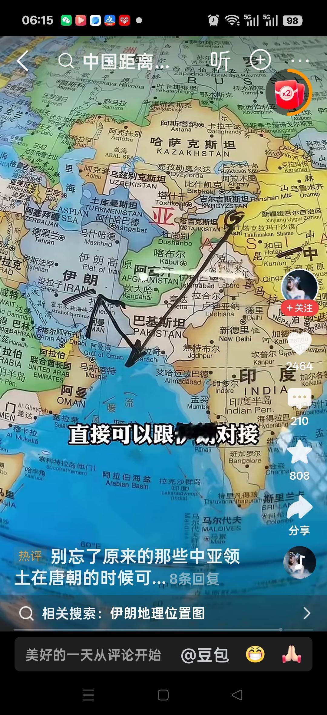 伊朗原来离中国这么近,中间就隔一个巴基斯坦,直接可以和伊朗对接。网友说:别忘了原