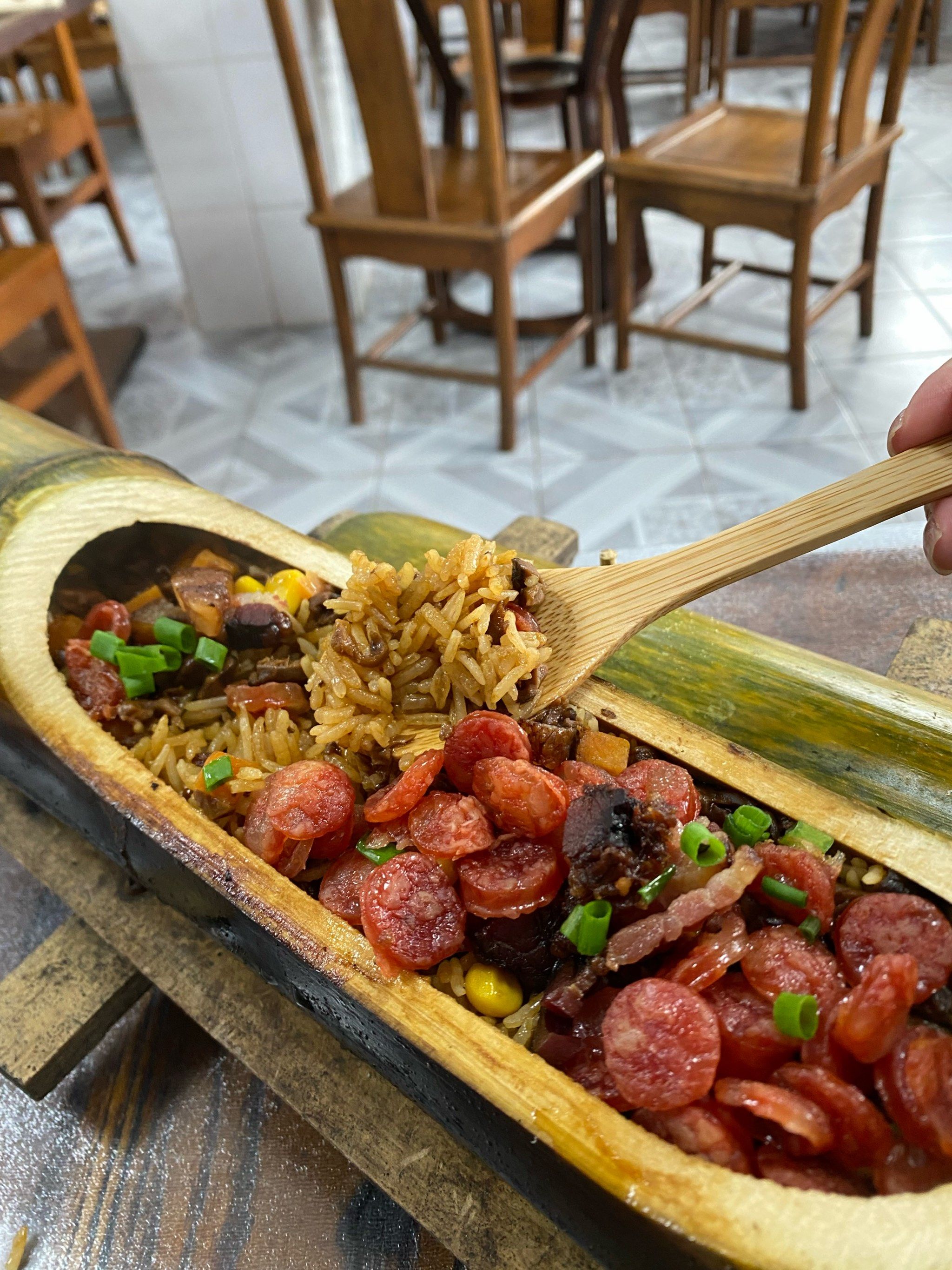 3️⃣.壮族竹筒饭,新鲜竹筒装入山兰米、腊肉、香菇,炭火慢烤,竹香彻底渗入米饭