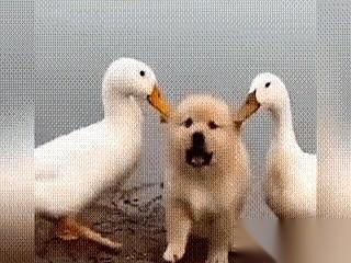 金毛路过池塘,冷不防被两只鸭子围住。 它们直接冲上来,尖嘴就往金毛额头上啄。一下