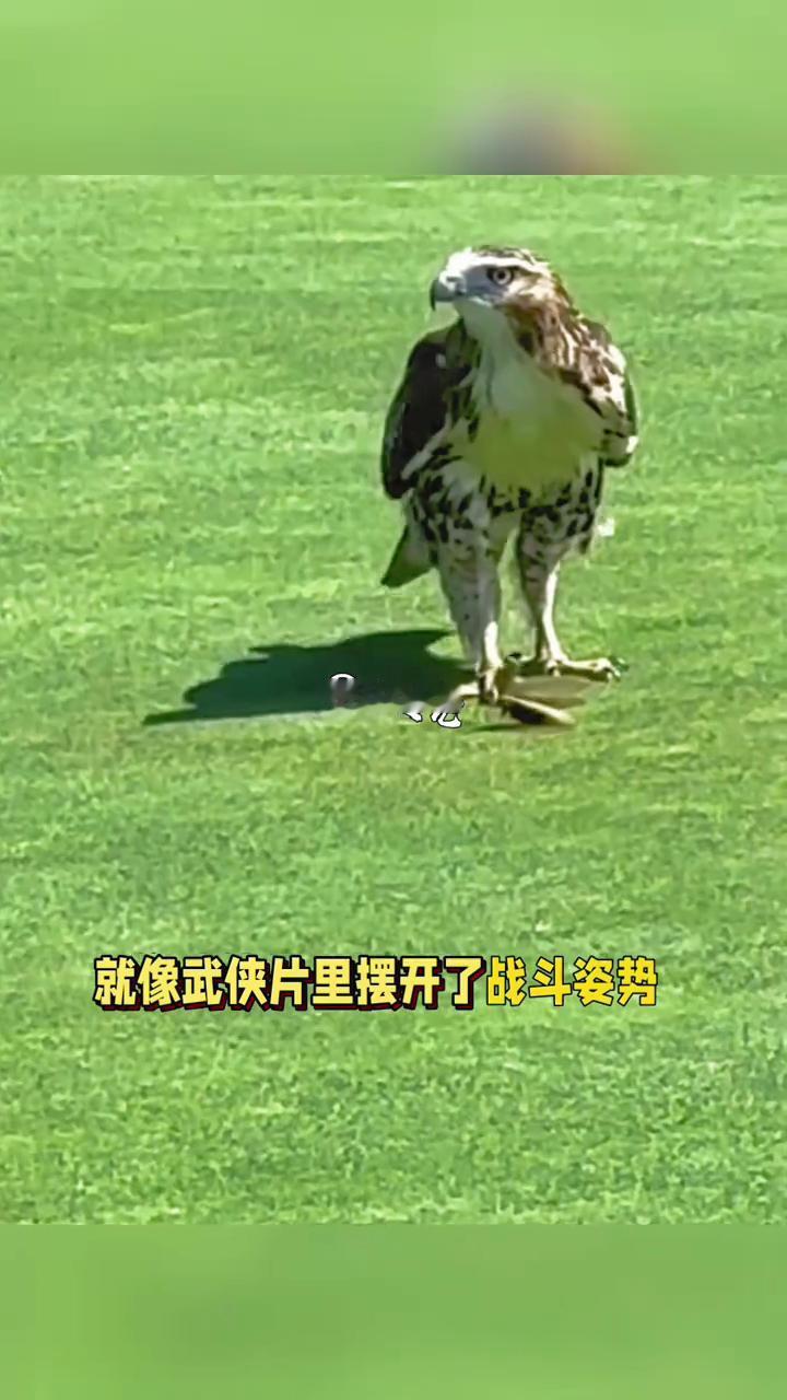 鹰与螳螂对决。 小连记。 一只老鹰落下来之后居然和一只螳螂对峙起来了,这场景真的