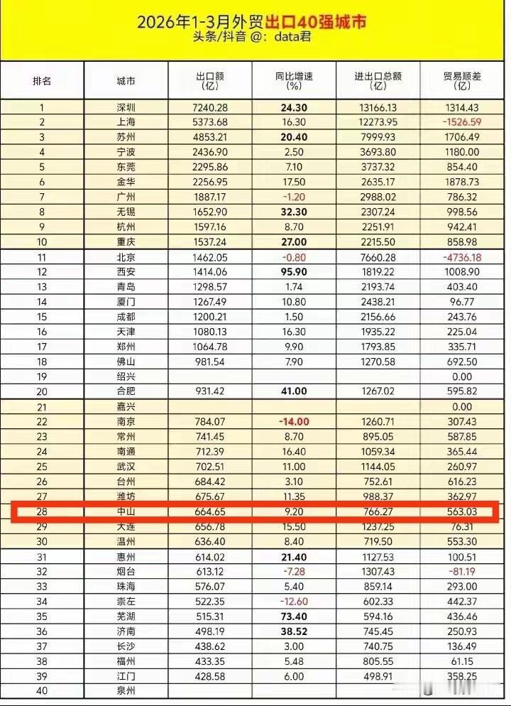 在2026年1 - 3月的外贸出口排名里,中山市位居全国第28、广东第五。中山的外贸出口一直表现出色,在全国城市中基本稳定在第28位,是广东省内仅次于深莞广佛的第五城。