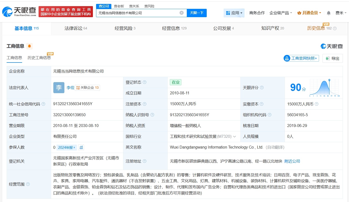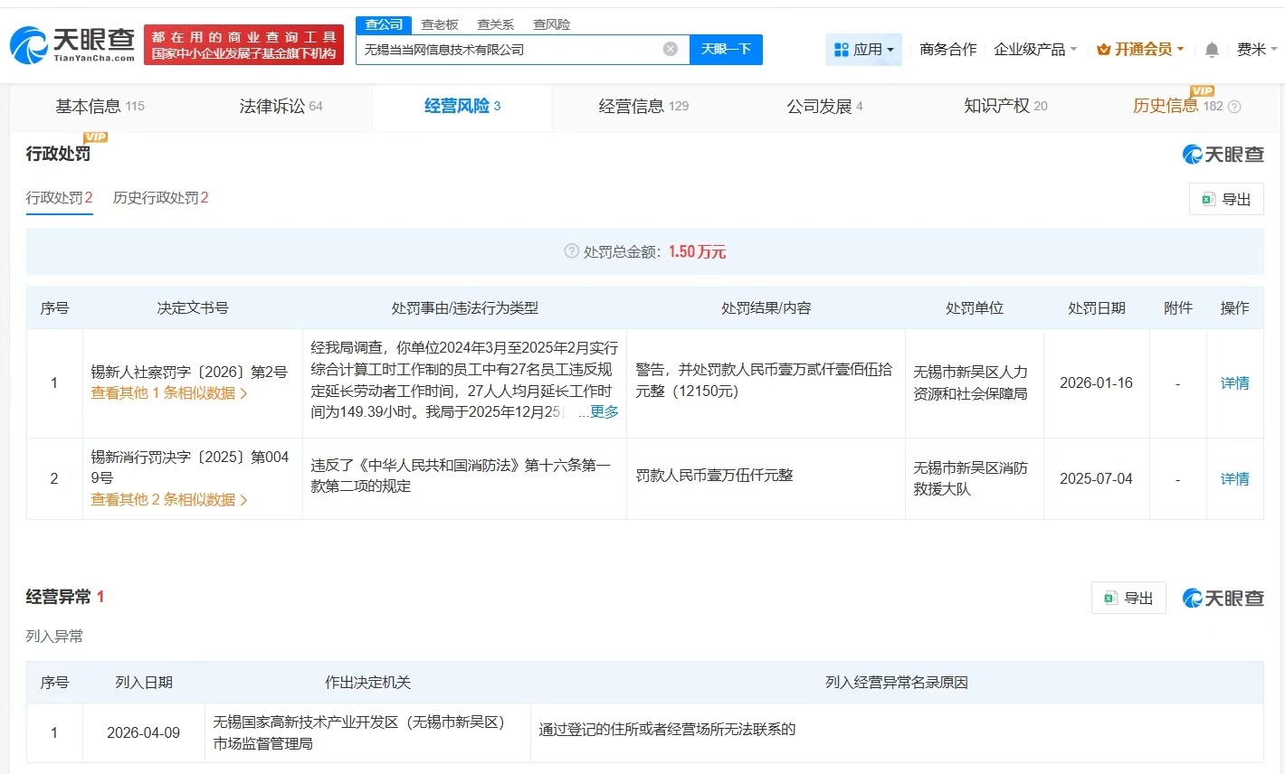 【#当当网员工超长加班公司经营异常#】 #当当网超长加班公司被列为经营异常# 天眼查经营风险信息显示,近日,无锡当当网信息技术有限公司因通过登记的住所或者经营场所无法联系,被无锡国家高新技术产业开发区(无锡市新吴区)市场监督管理局列入经营异常名录。无锡当当网信息技术有限公司成立于2010年8月,法定代表人为李俭,注册资本1.5亿人民币,经营范围包括计算机软件及硬件研发、技术服务及技术培训等,由北京当当网信息技术有限公司、北京当当科文电子商务有限公司共同持股。值得一提的是,今年1月,该公司因违反劳动法相关规定,被无锡市新吴区人力资源和社会保障局处以警告,并罚款1.2万余元。处罚事由显示,该公司2024年3月至2025年2月实行综合计算工时工作制的员工中有27名员工违反规定延长劳动者工作时间,27人人均月延长工作时间为149.39小时。
