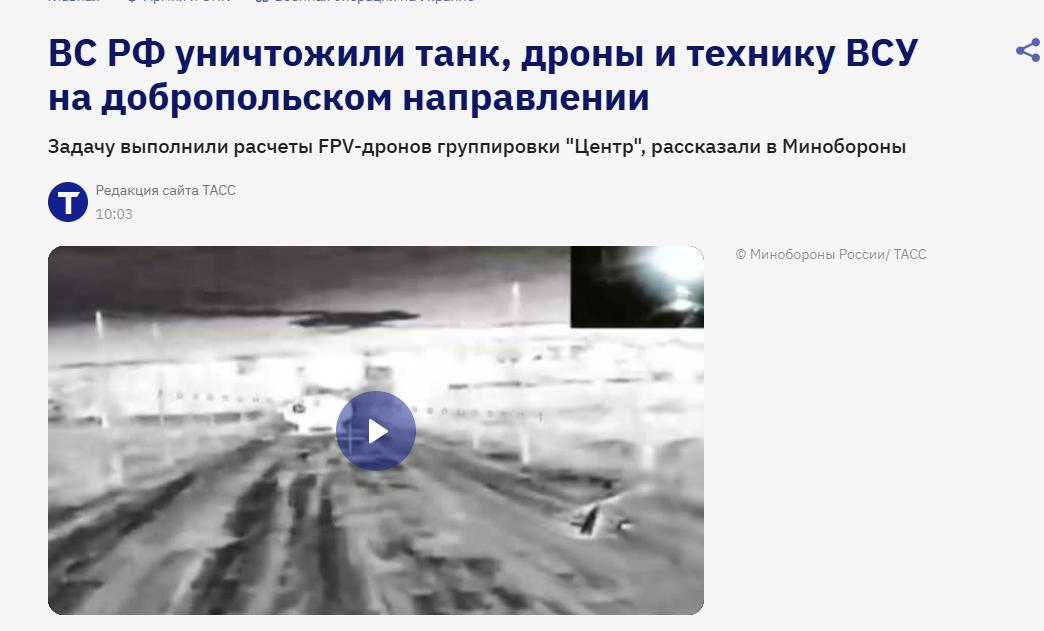 俄罗斯媒体4月20日报道称,俄罗斯国防部发布视频通报称,中央集团军部队在多布罗皮利亚方向实施了一系列精准打击。在对战区进行空中侦察时,无人机专家探测到乌军一辆装甲运兵车和一辆坦克的动向,坐标实时传输至FPV无人机机组,后者使用高爆炸药将其摧毁。在自由搜索模式下,无人机飞行员还攻击了敌方皮卡车、人员以及运送装备与弹药的机器人系统。此外,该集团攻击无人机专家迅速摧毁了一架带有中继器和布雷系统的六旋翼无人机。与此同时,中央集团军的“冰雹”多管火箭炮系统机组摧毁了多布罗皮利亚地区的一个据点,并消灭了乌方人员。攻击无人机操作员也在同一地区消灭了敌方有生力量。