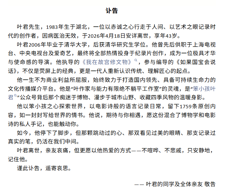 叶君先生,1983年生于湖北,一位以赤诚之心行走于人间、以艺术之眼记录时代的创作者,因病医治无效,于2026年4月18日安详离世,享年43岁。