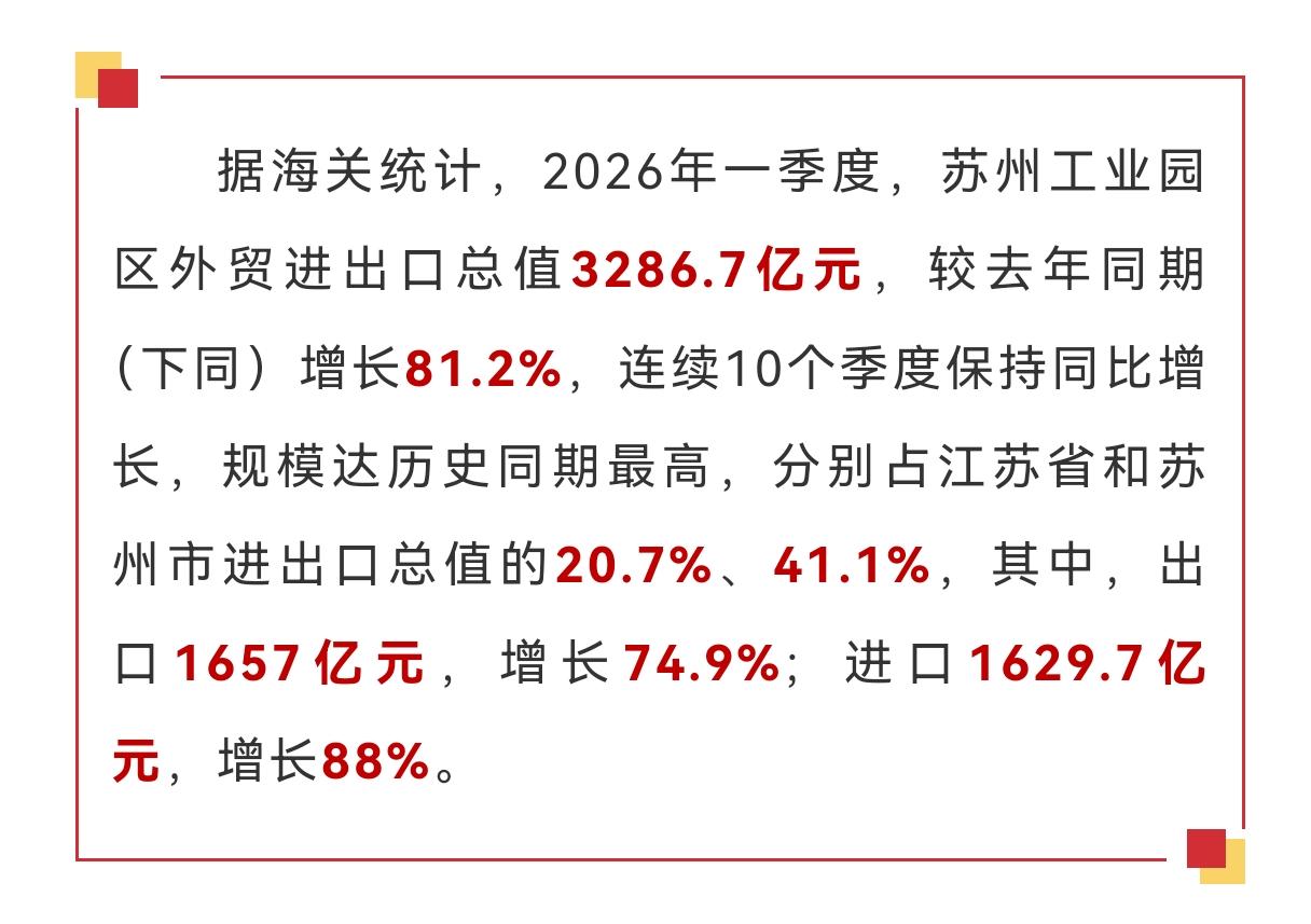2026年一季度,苏州工业园区外贸交出亮眼成绩单,进出口总值达3286.7亿元,同比暴涨81.2%,连续10个季度实现同比增长,规模创下历史同期最高水平。其进出口总值分别占据江苏省、苏州市外贸总量的20.7%、41.1%,出口1657亿元、进口1629.7亿元,均保持高速增长。
