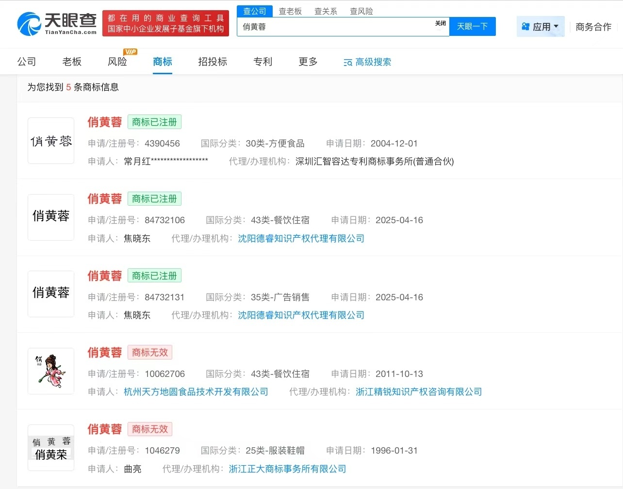 【#多枚俏黄蓉商标已注册成功# 】#俏黄蓉一个月涨粉6.6万# 据媒体报道,近日,网红“俏黄蓉”曾遭家暴后迎来重生,其搬进新房后哭了的情况引发关注。天眼查知识产权信息显示,“俏黄蓉”已被申请注册为商标,申请人包括杭州天方地圆食品技术开发有限公司及多个自然人等,国际分类包括方便食品、广告销售、餐饮住宿等,当前部分商标已成功注册。第三方数据显示,俏黄蓉近一个月涨粉6.6万,总粉丝数超84万。#俏黄蓉已被申注为商标# #遭家暴俏黄蓉离婚给了前夫25万#