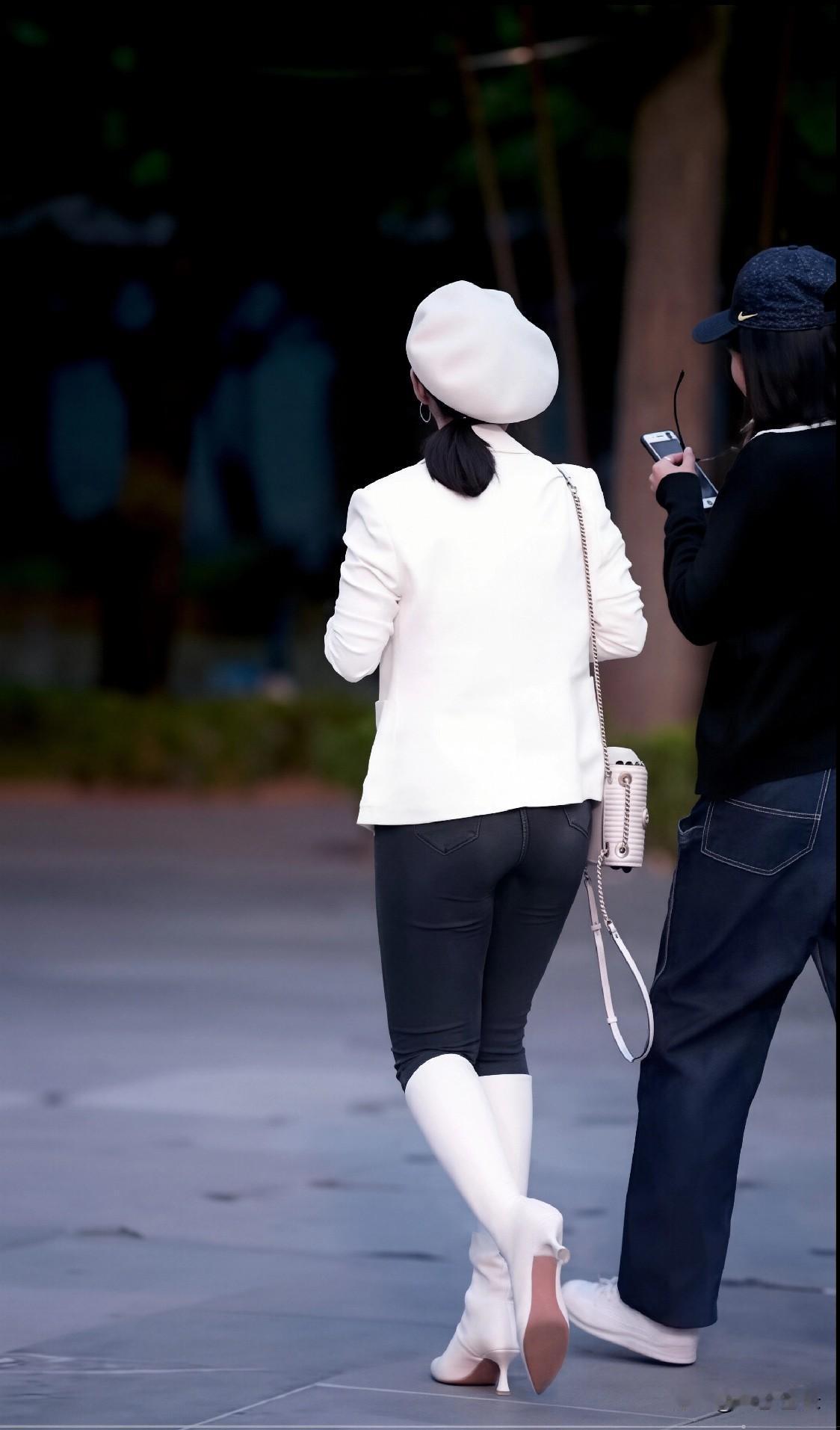 ✅ 穿搭公式:米白色西装外套 + 深灰色紧身九分裤 + 米白色尖头细高跟长筒靴