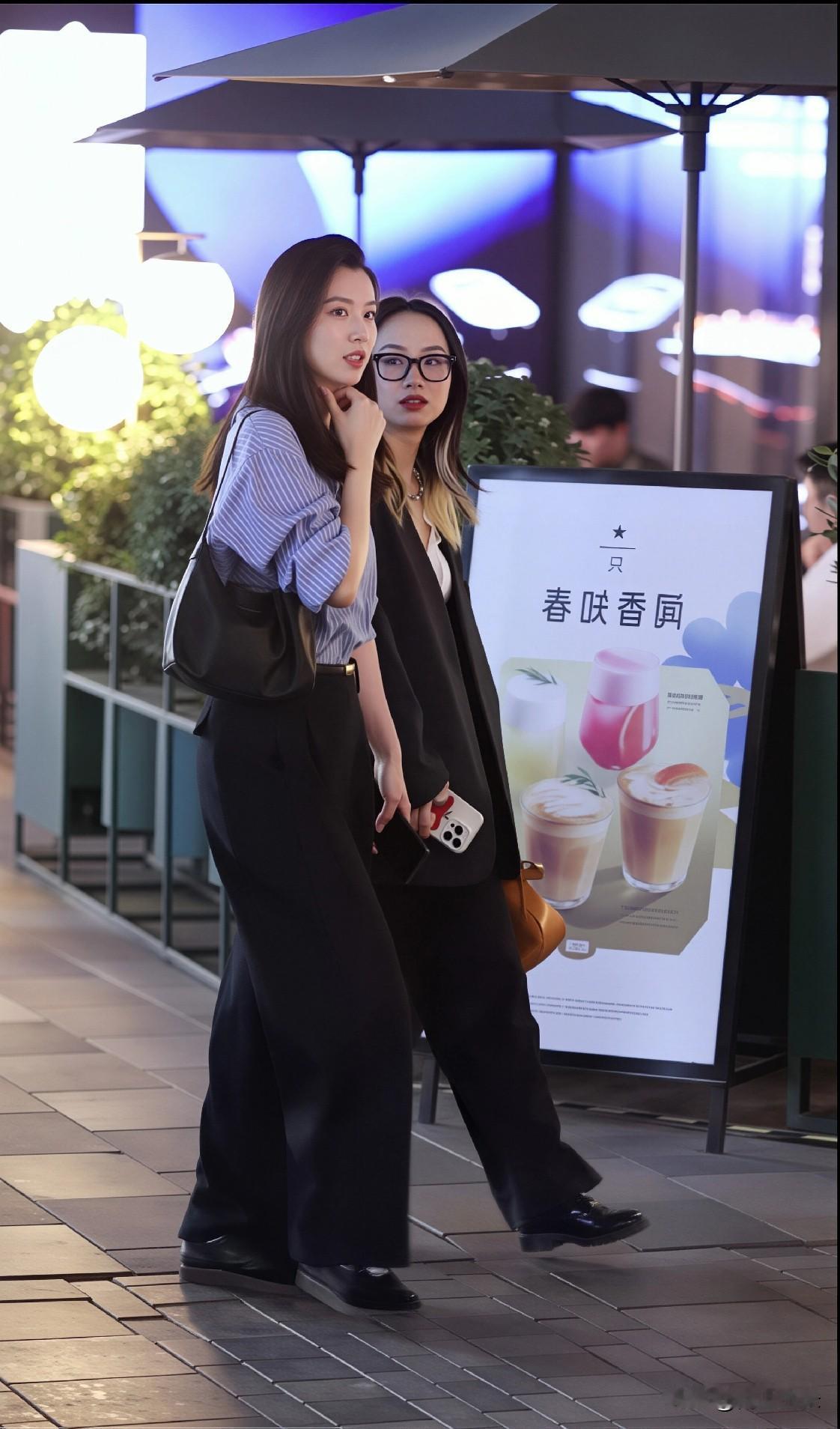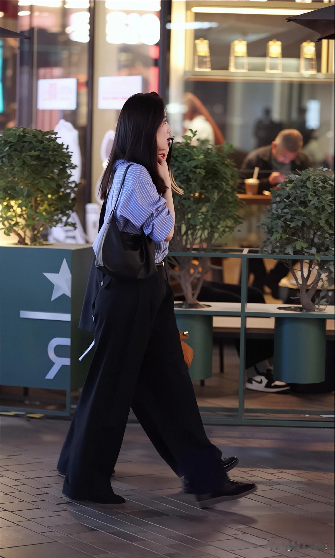 蓝白竖条纹长袖衬衫,搭配黑色阔腿裤,简约又经典。黑色软皮单肩包与黑色系带皮鞋呼应,增添精致感。整体穿搭休闲舒适,适合日常出行,夜晚暖光背景下,更显随性自在。