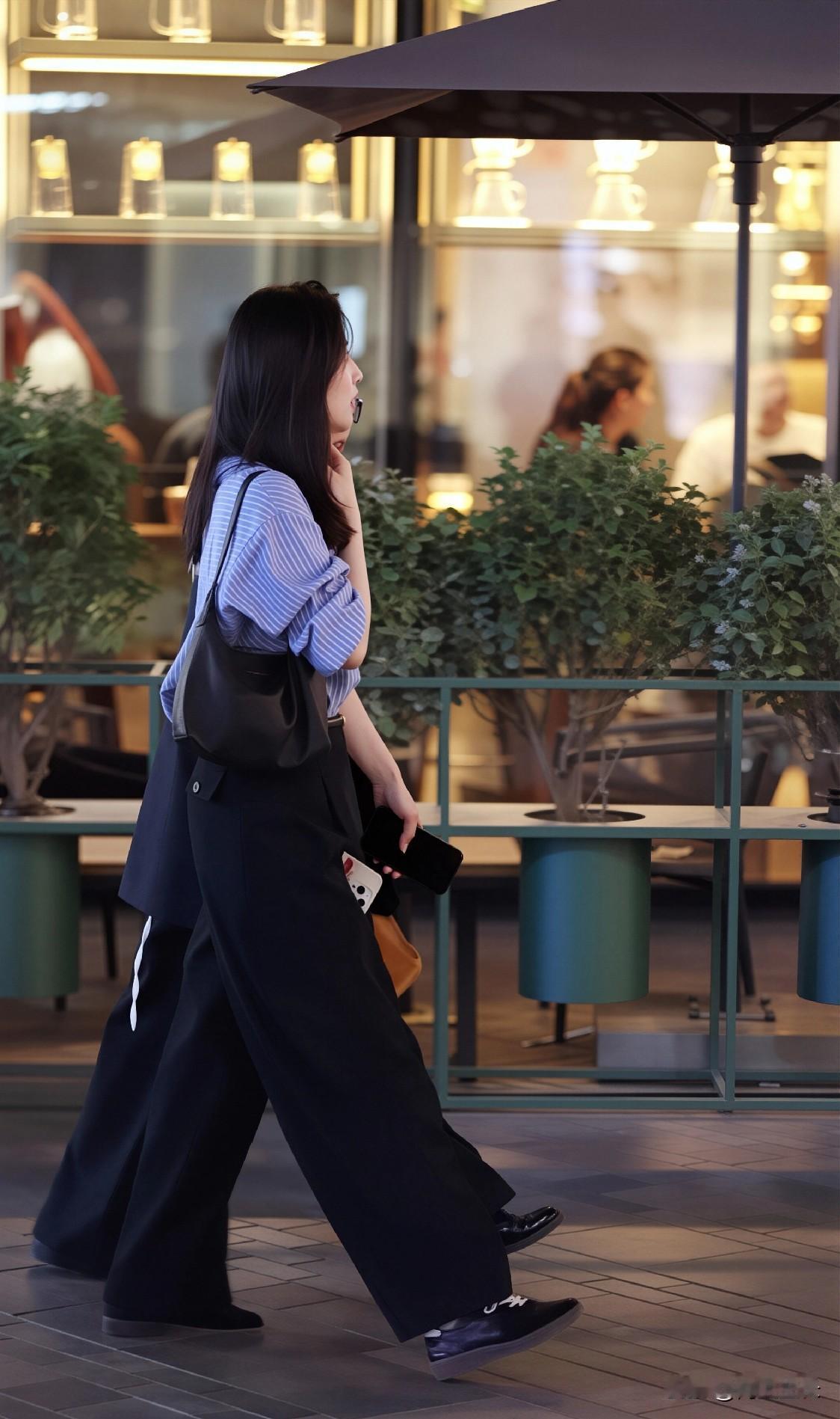 蓝白竖条纹长袖衬衫,搭配黑色阔腿裤,简约又经典。黑色软皮单肩包与黑色系带皮鞋呼应