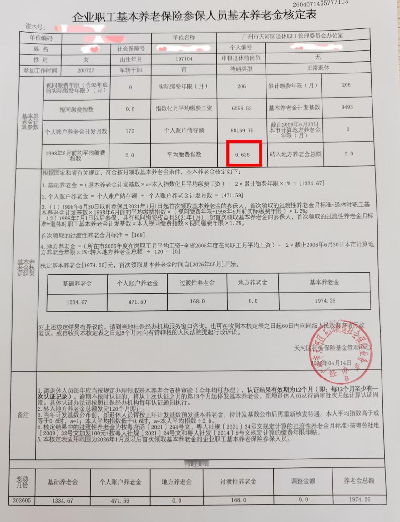 终于到了开盲盒的日子,1974元,如果减去168元的过渡性养老金,就是1806元,与粤省事测出的1855只相差几十元,粤省事还是算得比较准的。