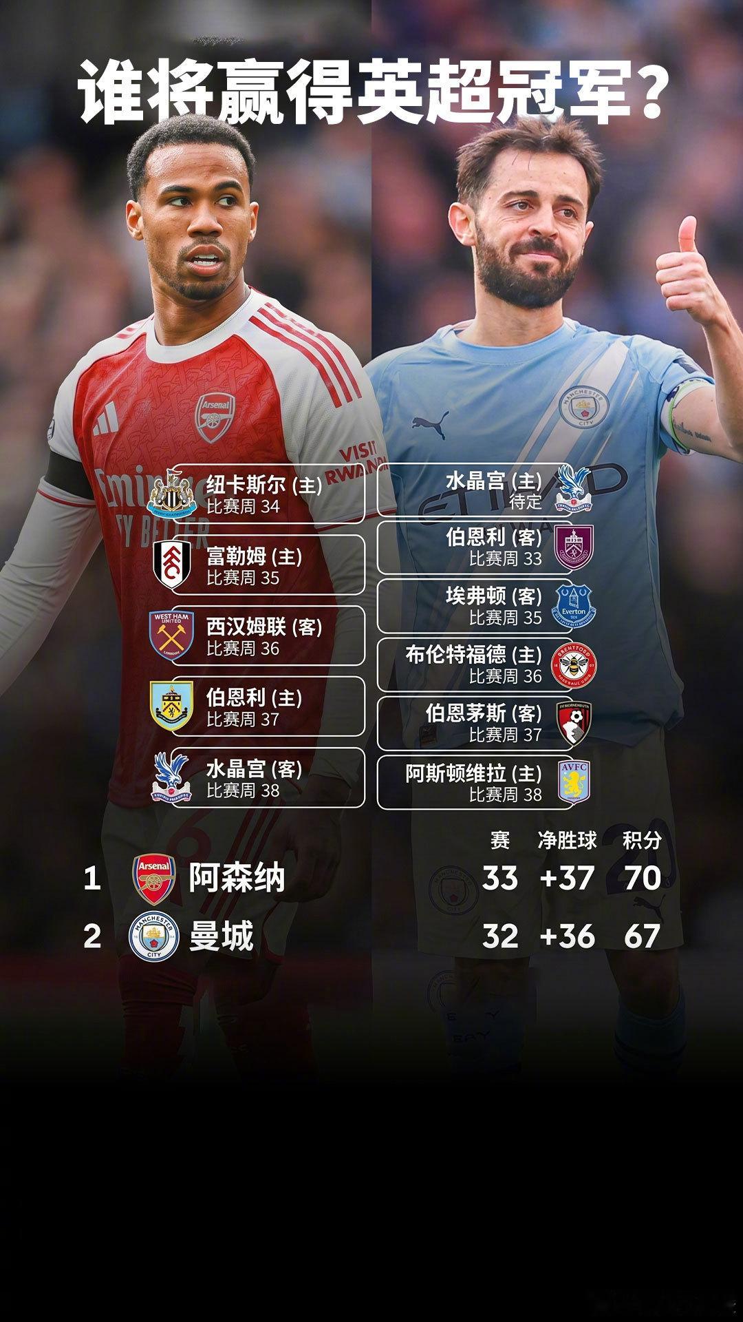曼城本季如果能拿到英超冠军,瓜迪奥拉将追平弗爵爷的欧洲五大联赛夺冠次数纪录。五月份蓝月军团的赛程安排还有一些不确定性,如果他们顺利晋级16号的足总杯决赛,那原定17号客战伯恩茅斯的比赛就要改期。还有一场主场对水晶宫的补赛,因为水晶宫要踢欧协杯半决赛,日期无法确定。这意味着五月份赛季最后三周阿森纳是一周一赛,曼城很可能连续两周一周双赛。