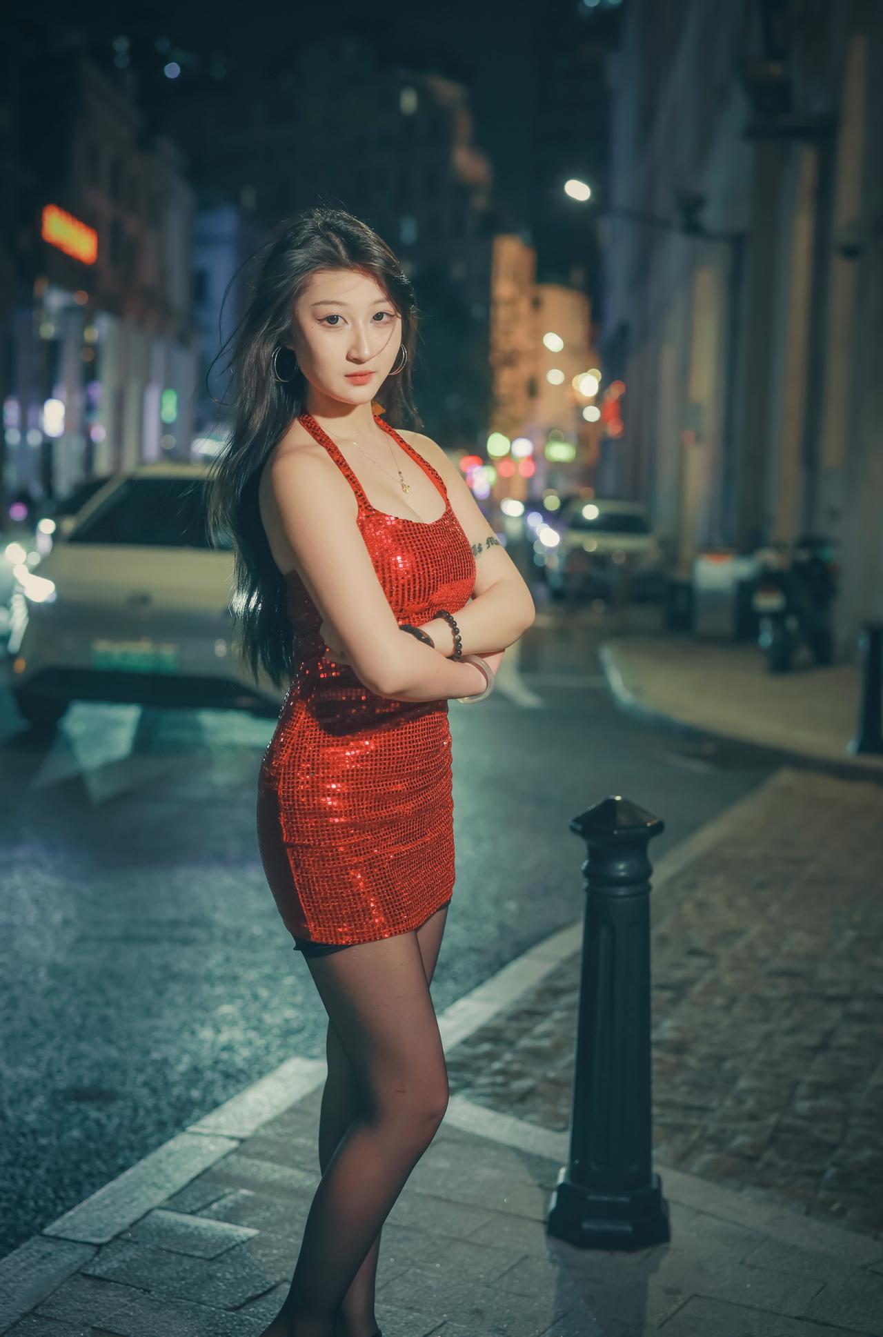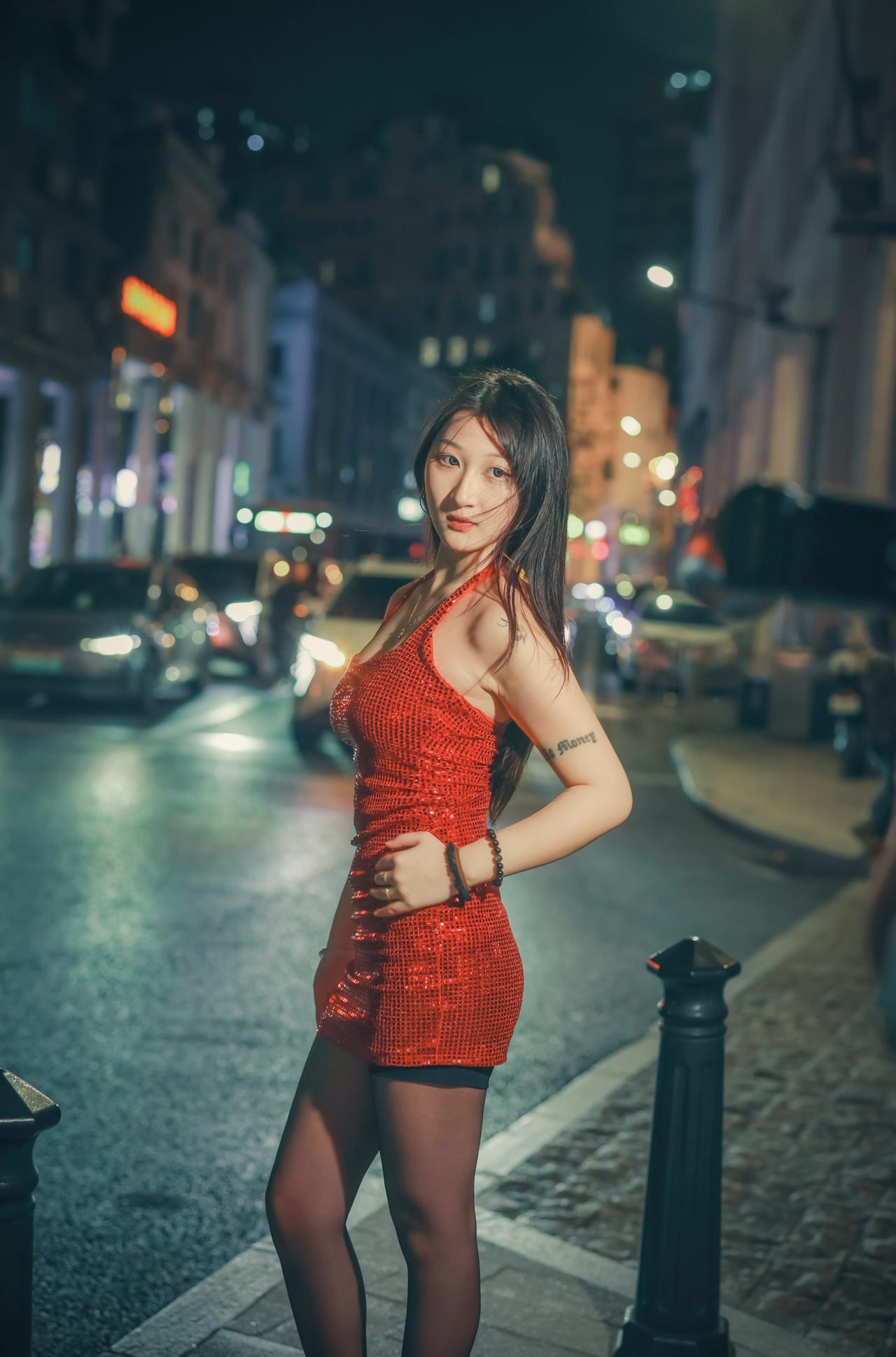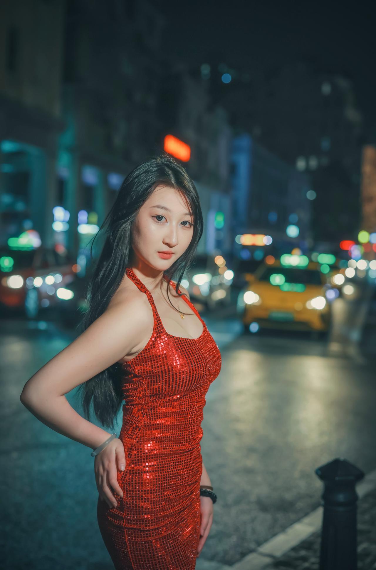 身穿红衣的女子,优雅地站在月光下,她在夜的幕布下散发出一种迷人的韵味,令人陶醉。