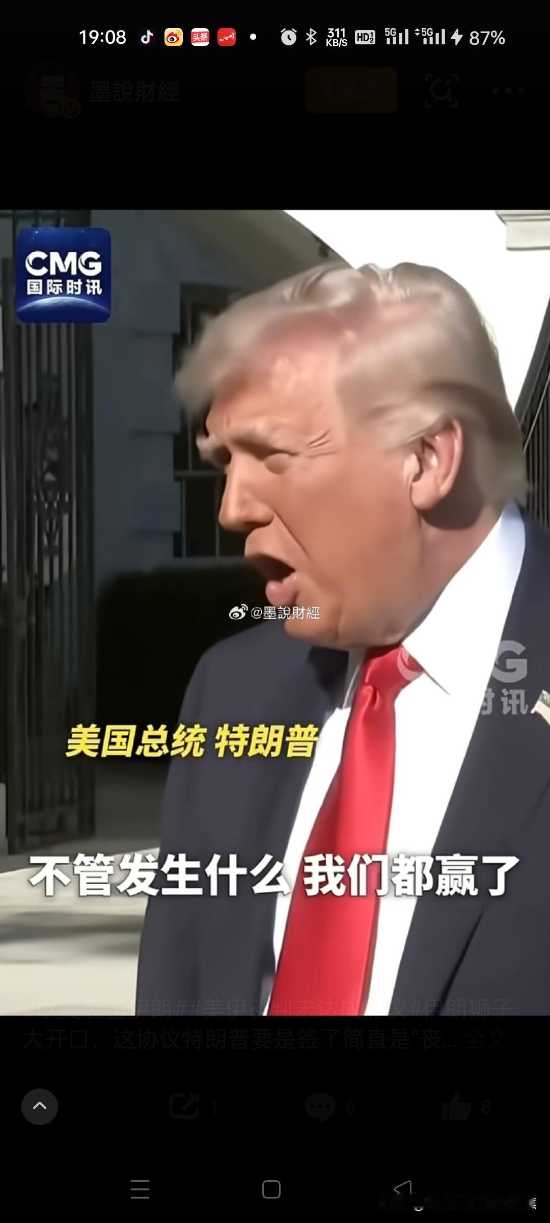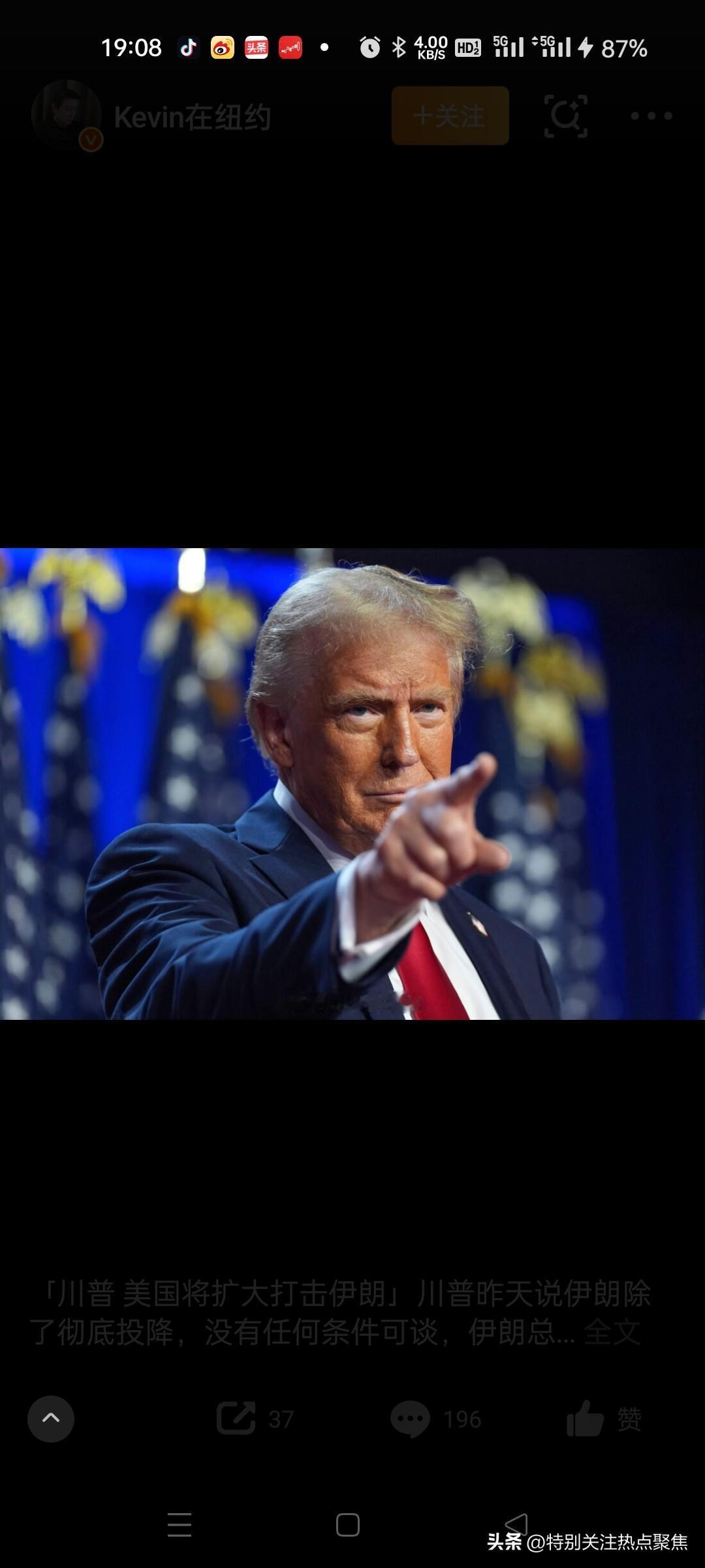 特朗普将总统的道歉歪曲为“伊朗已投降”,宣称“中东国家感谢美国”,还扬言扩大打击范围至平民目标,企图瓦解伊朗的抵抗意志。