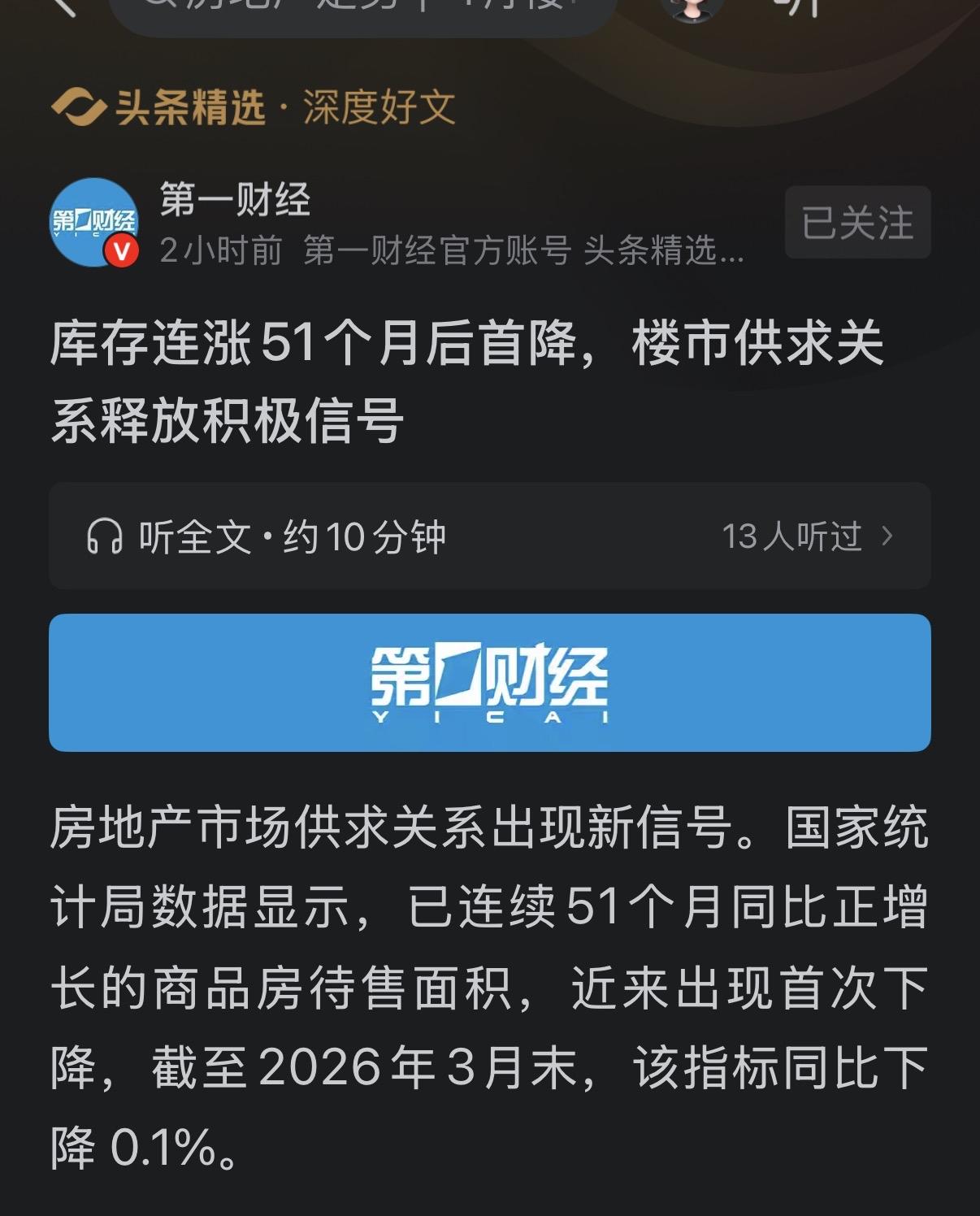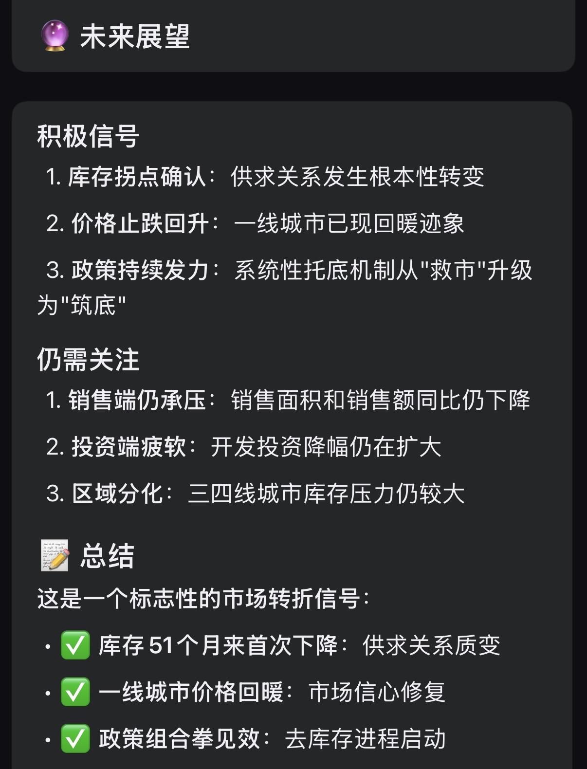 一线城市房价全部上涨,你以为是偶然发生的吗?4月21日,今天,重磅消息!房地产供求关系已发生根本性转变!房地产市场待售面积51个月以来首次下降!市供求关系已发生质变!正式从供大于求进入了供求平衡新阶段!你以为这就完了?没那么简单!这才刚起步,房地产开发商已大量退场,新开工面积新竣工面积,还在快速下降,同时,市场上二手房挂牌的大多数是恐慌性跟风抛售,在一线城市房价已经开始上涨的情况下,供求关系的质变将进一步作用于市场,大量的二手房挂牌将快速退场,大量观望的买家将加快入场,一场历史性的房价上涨浪潮就要开始了!一切都静悄悄地发生,在你不经意之间,可能什么都变了!政策还在跟进,,,,开发商退出了就回不来,,,房地产开发龙头企业的好运气来了,市场份额将加大,股票将上涨,,市场还在向前,,,,等着一场历史性的新戏的开演!