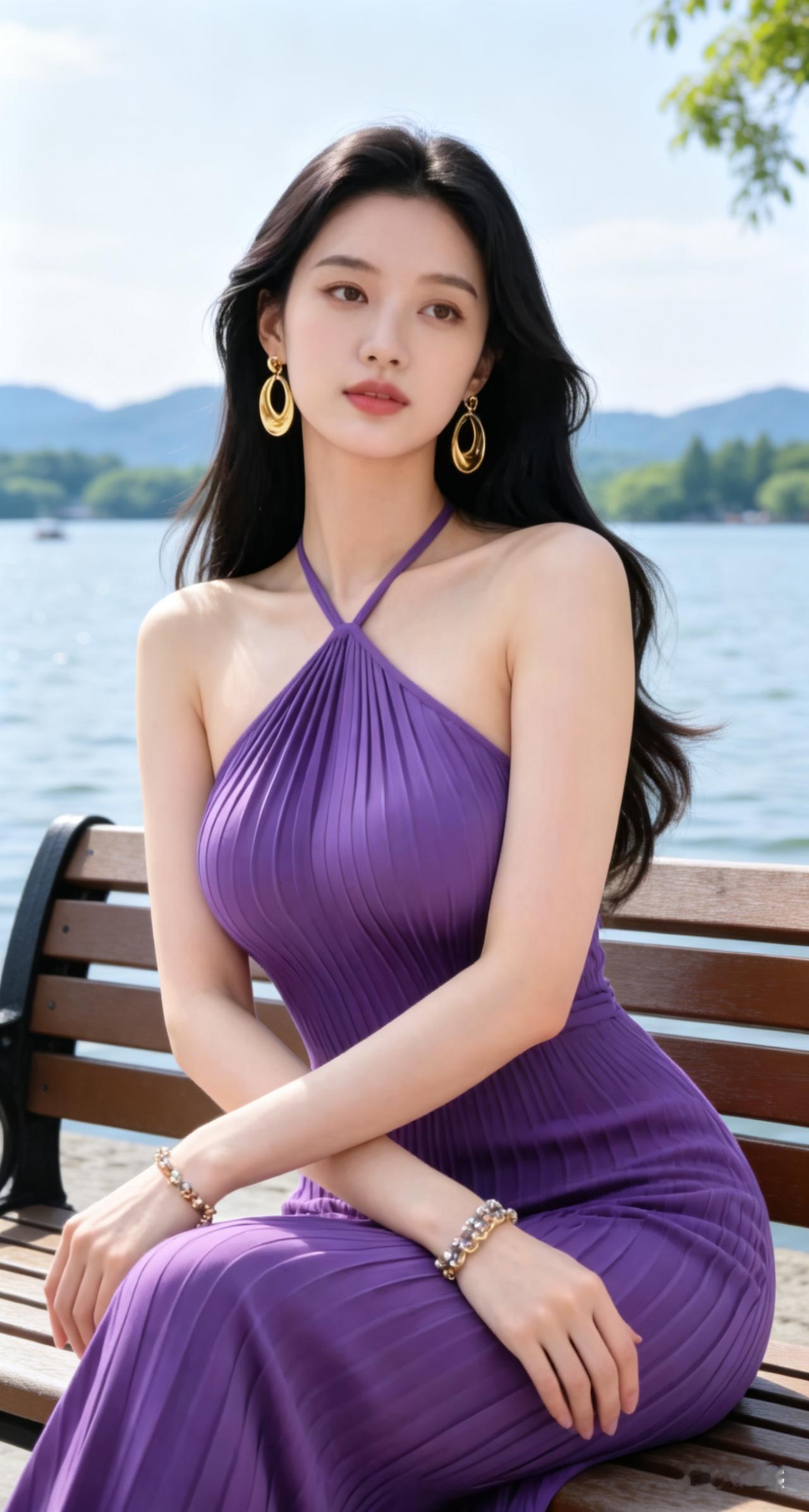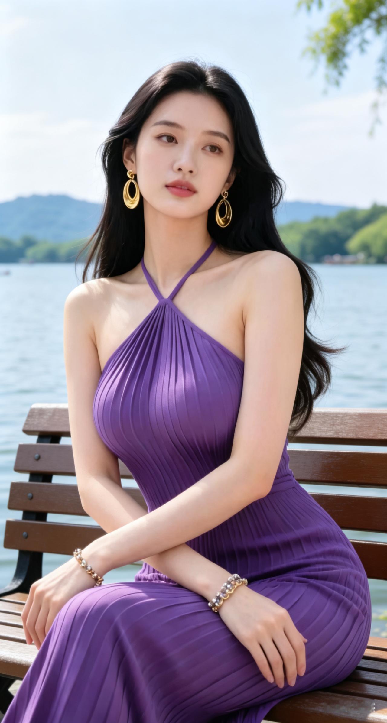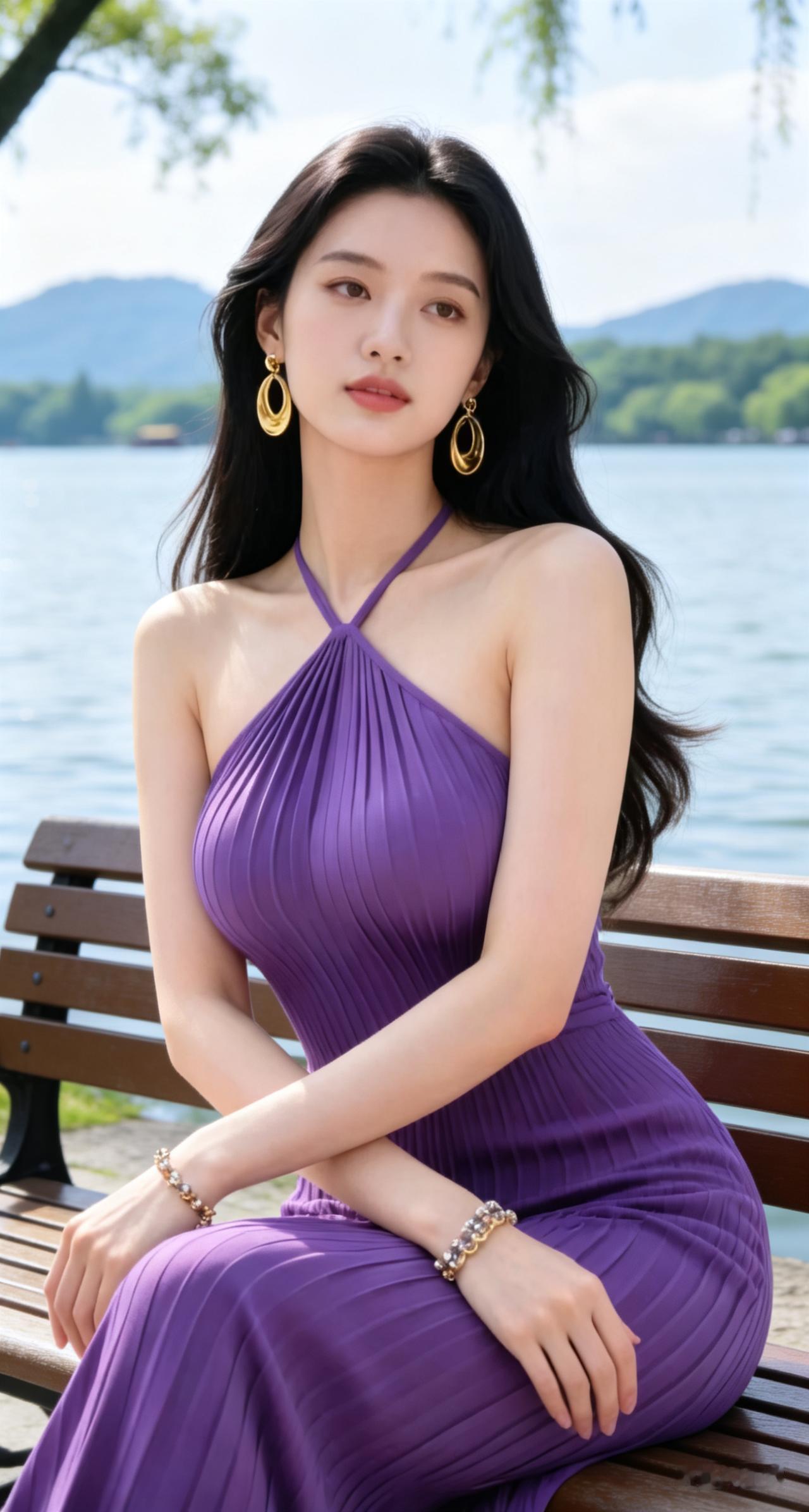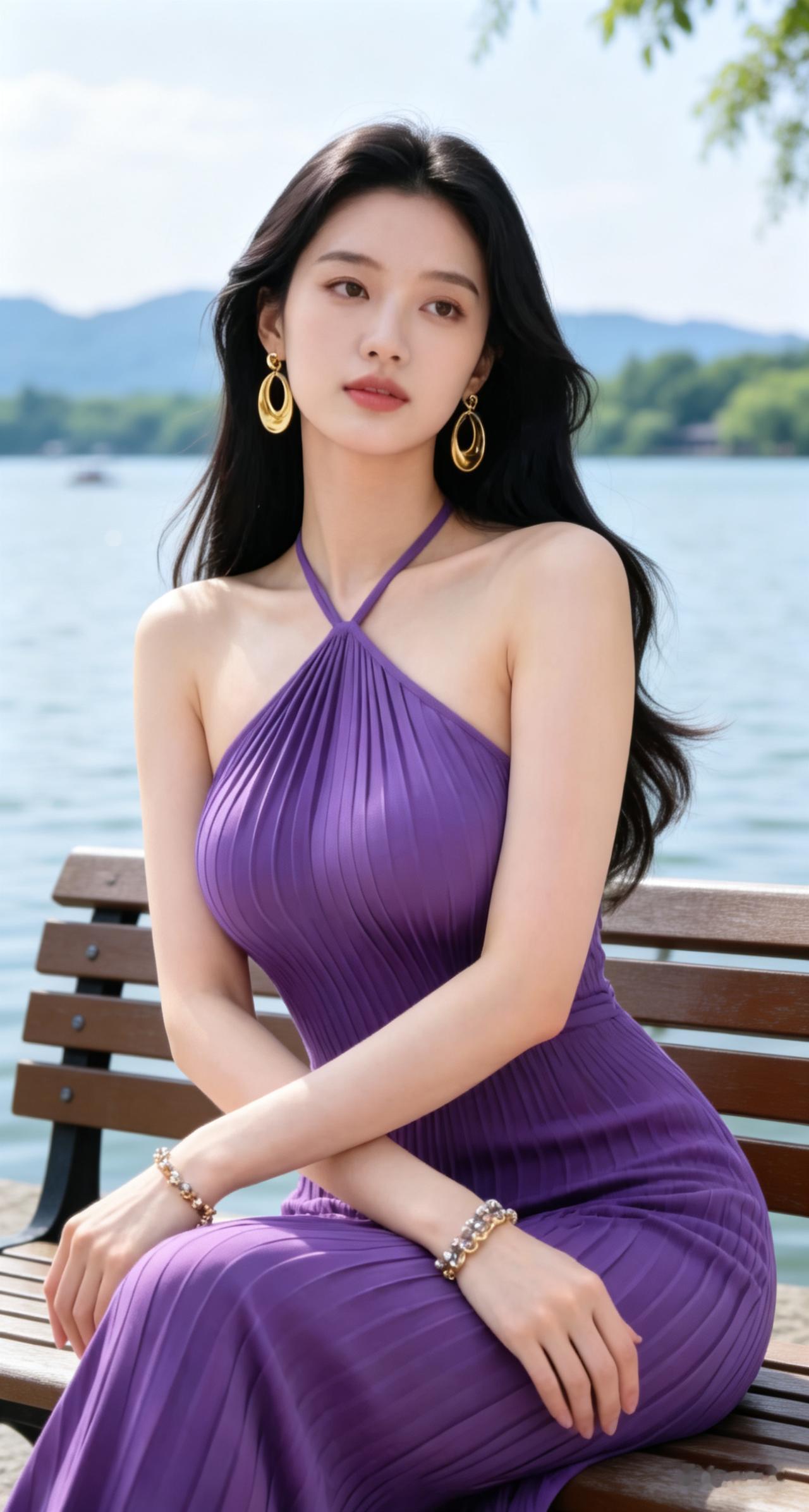 优雅紫裙,湖畔静坐,耳畔金环,尽显迷人风情。