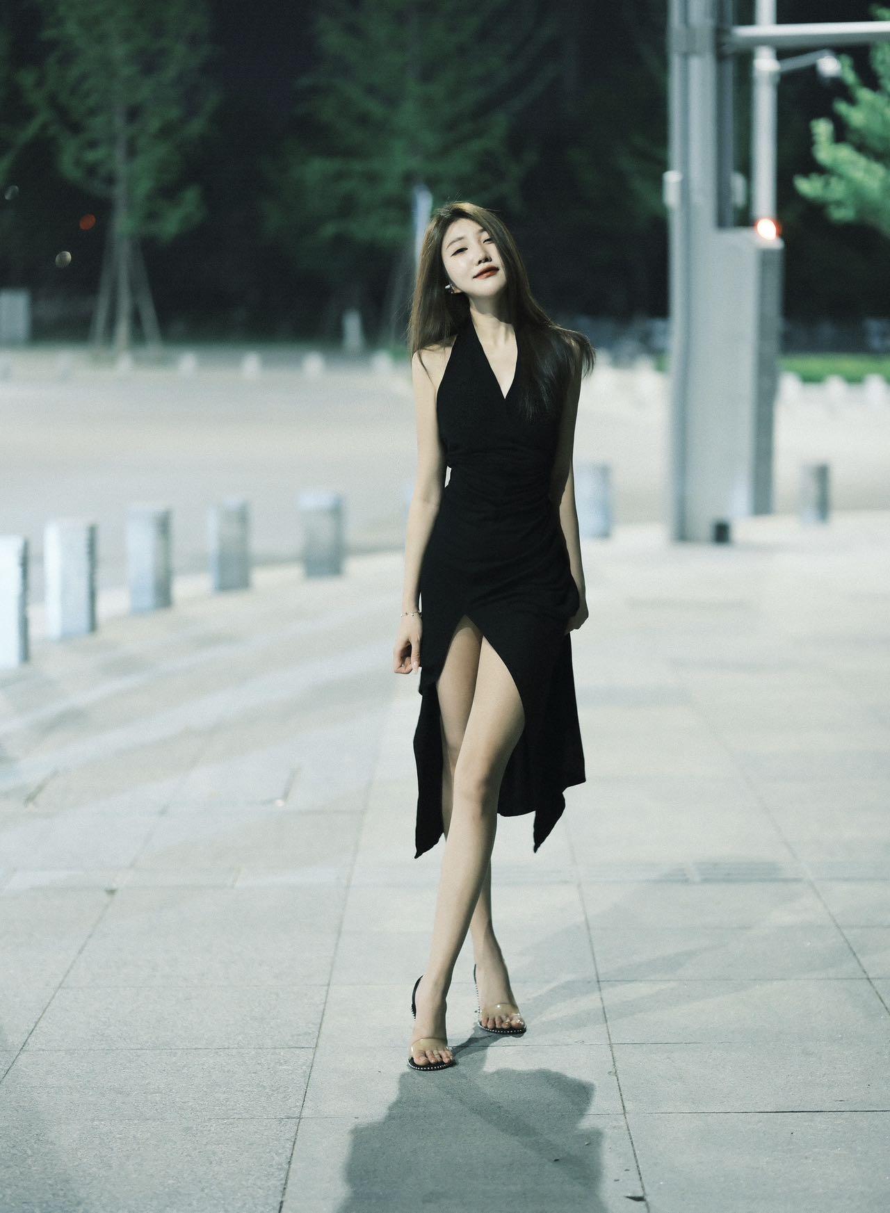 夜晚漫步,黑裙飘逸,自信步伐,都市风范。