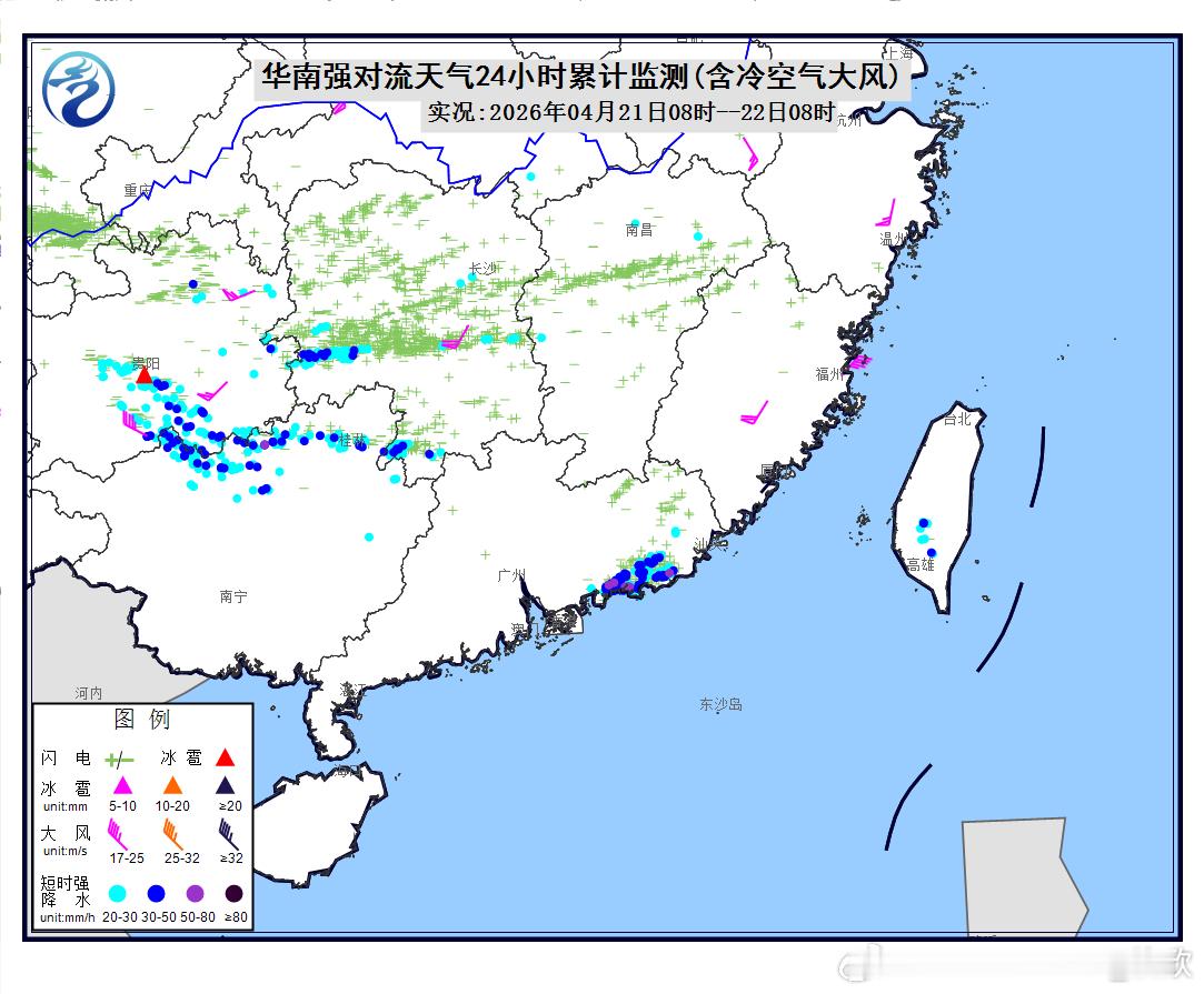 4月23日08时至24日08时,云南东部、广西东部、广东中北部、福建东部、台湾岛西部等地部分地区有大到暴雨(50~90毫米)。江南降雨基本结束。4月24日08时至25日08时,海南岛西部、广东东南部等地部分地区有大雨,局地暴雨(50~60毫米)。