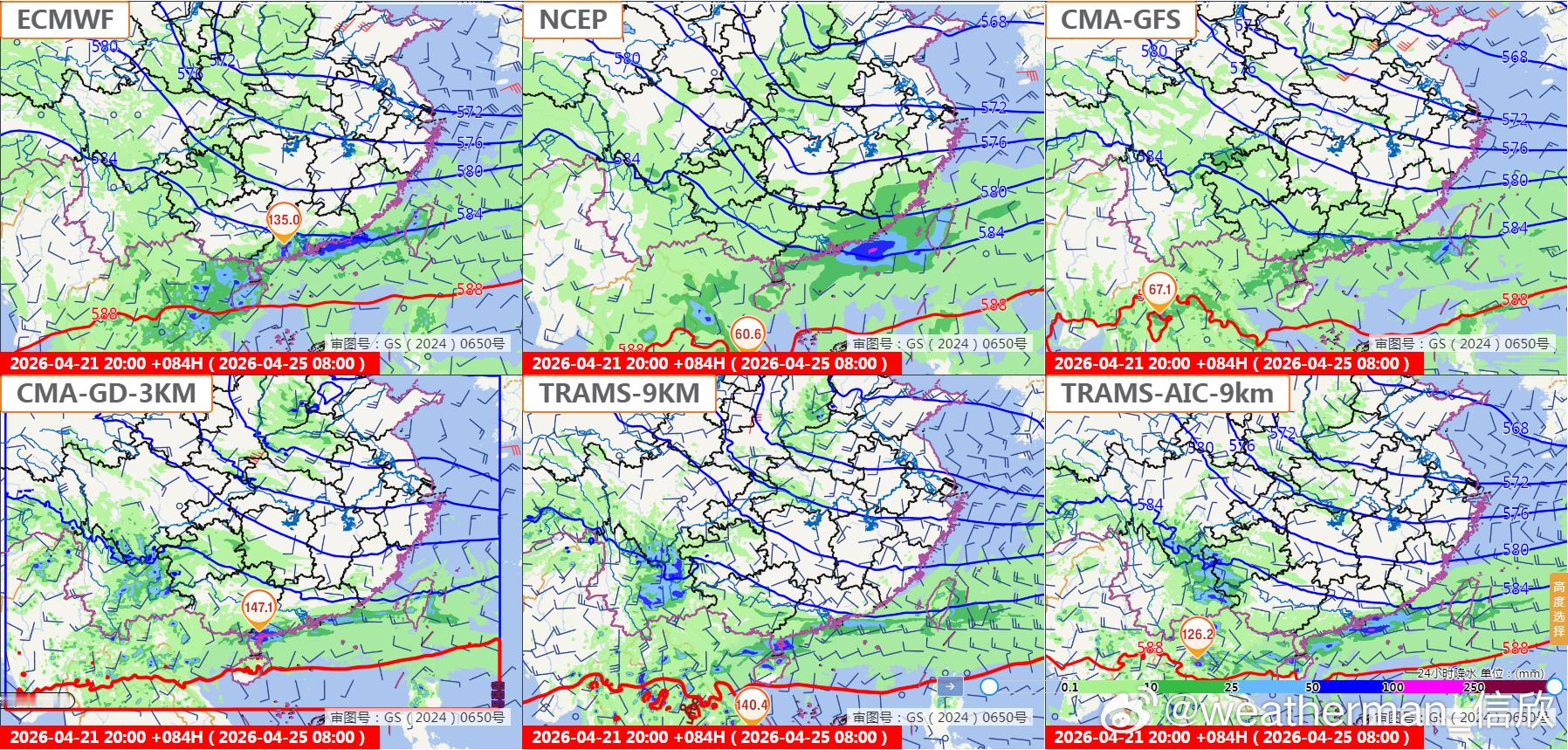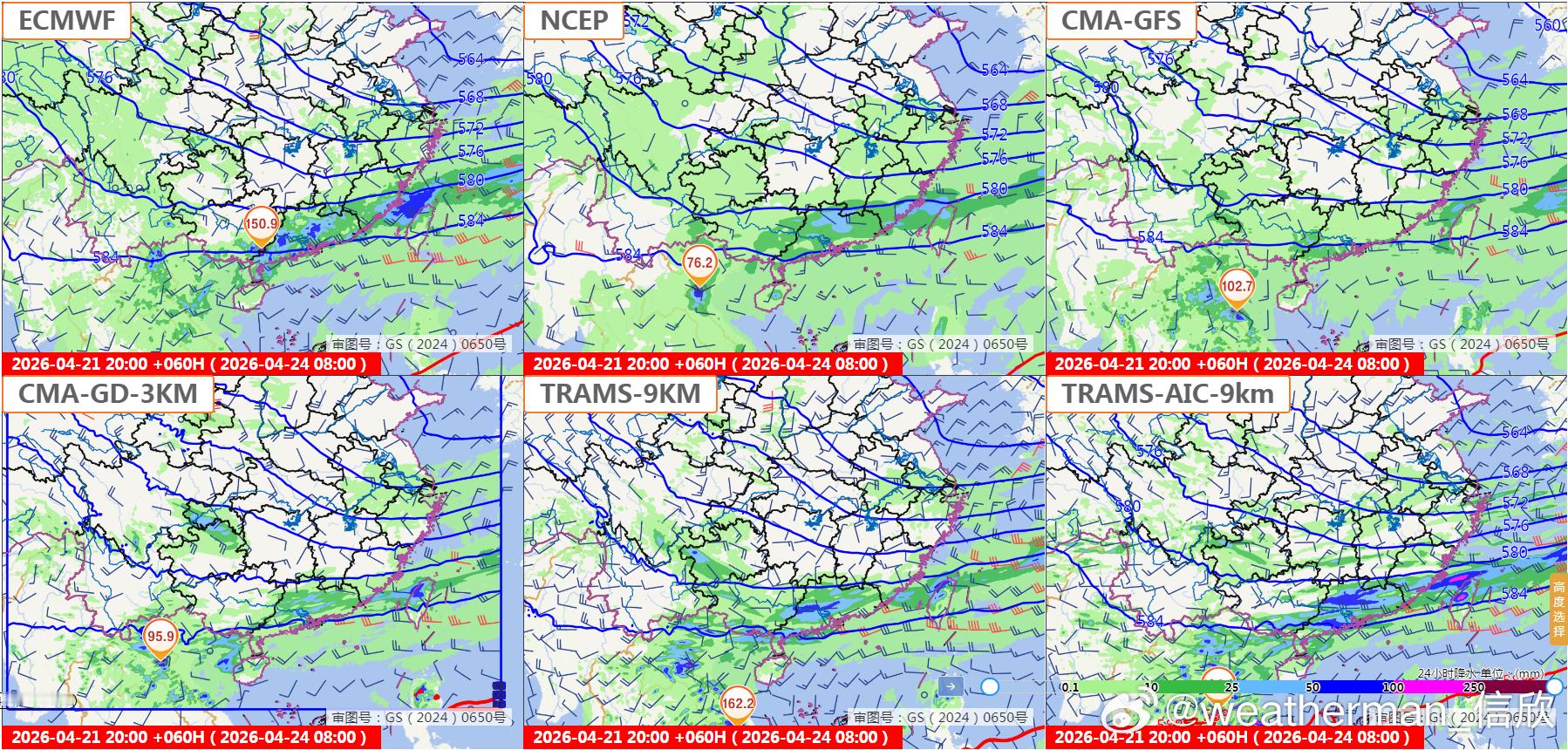 图7-9为数值预报对比,每个图上方三个为欧美中的全球模式,下方为我国中尺度模式。由于华南存在对流能量,如果对流超预期,导致局地的降雨强度可能强于全球模式的预期。但中尺度模式往往把对流报得过强,因此全球模式和中尺度模式,平均一下,可能更接近实际。