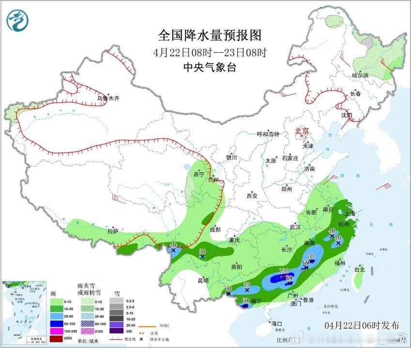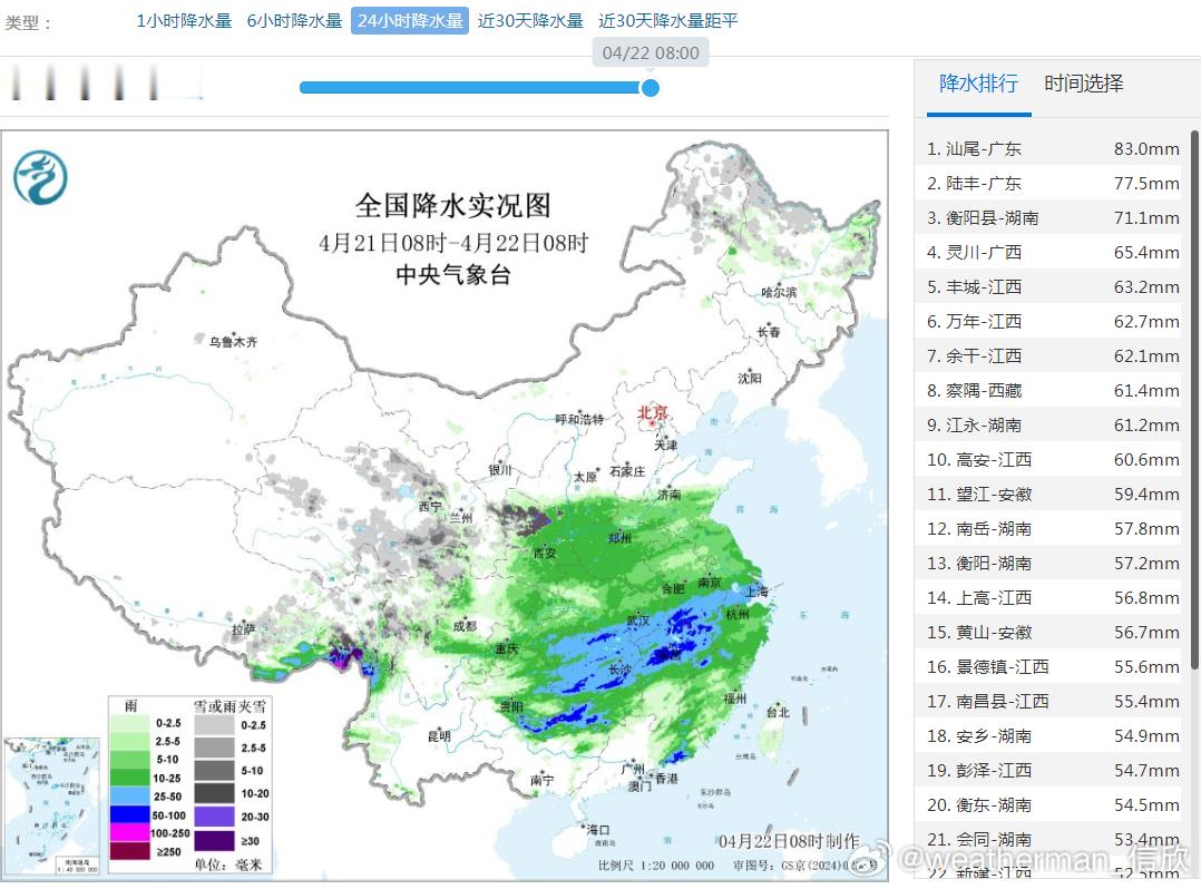 中央气象台4月22日06时发布暴雨蓝色预警:预计,4月22日08时至23日08时,云南西北部、广西西部和东北部、广东北部、湖南南部、江西中南部和东北部、浙江南部、福建西部和北部等地部分地区有大到暴雨,其中,湖南南部、广东北部等地局地有大暴雨(100~130毫米)。