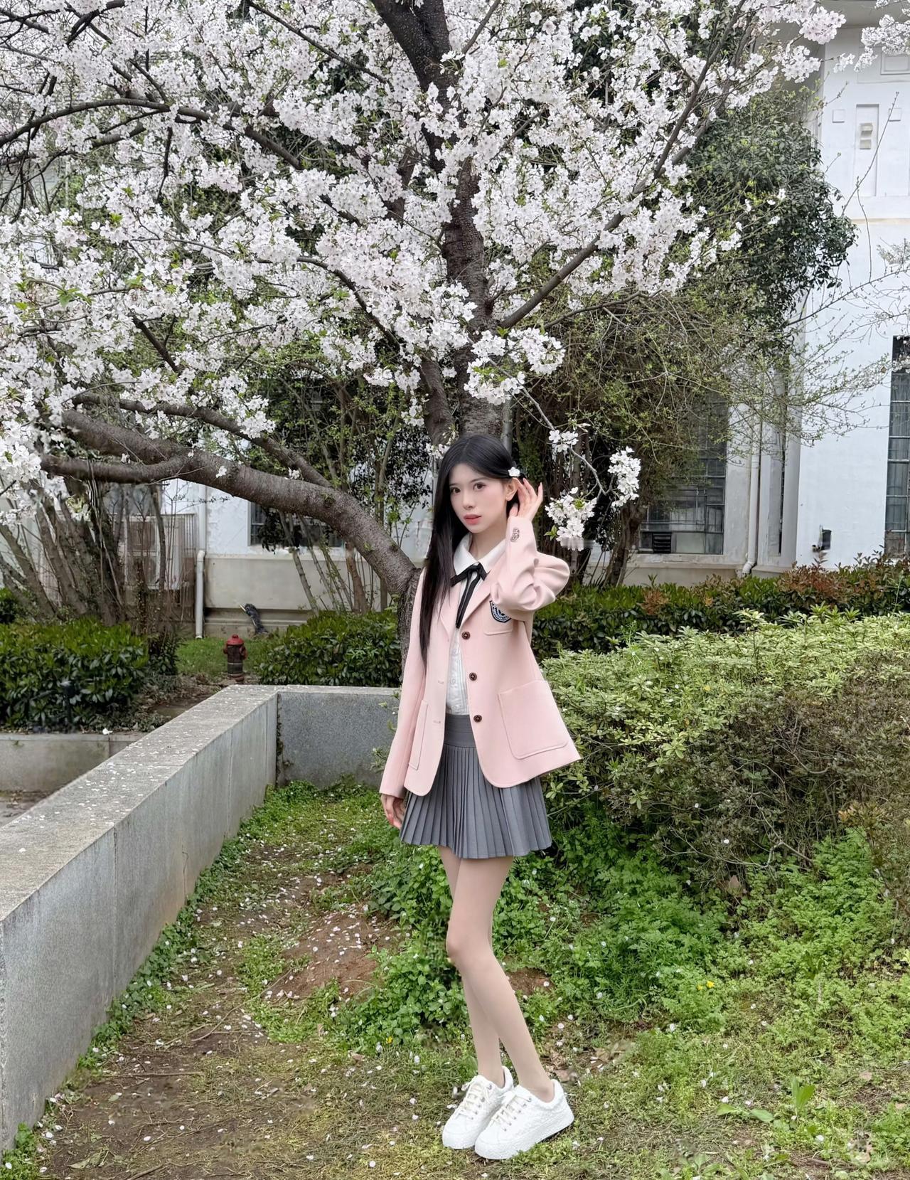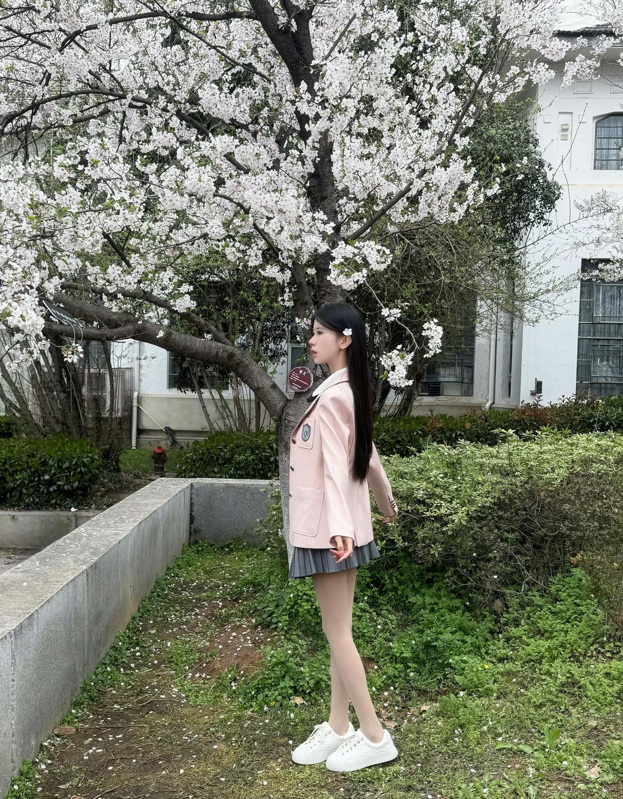 在樱花树下,微风轻拂,花瓣如雨般飘落,仿佛时间也在此刻静止。一袭红裙,映衬着春日