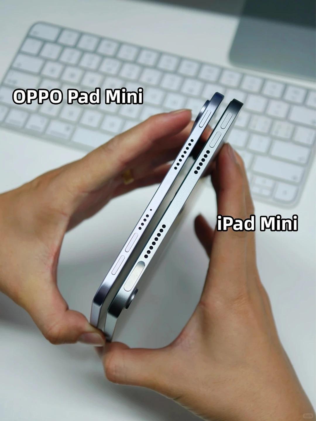 再看OPPO Pad mini,整体非常轻薄,只有5.39mm/279g,甚至比iPad mini薄,机身小巧便携,而且屏占比更高,高刷屏用起来丝滑,刷视频还是玩游戏这些日常娱乐、轻办公都很顺手,而且8000mAh电池很大,续航给力,功能配置上也更贴合普通用户。 同样是小平板,苹果胜在生态,OPPO赢在轻薄全能,到底怎么选更适合自己了。