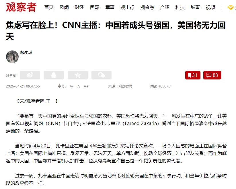 CNN主播急了:中国要是成头号强国,美国真没辙了 美国CNN主播法里德·扎卡里