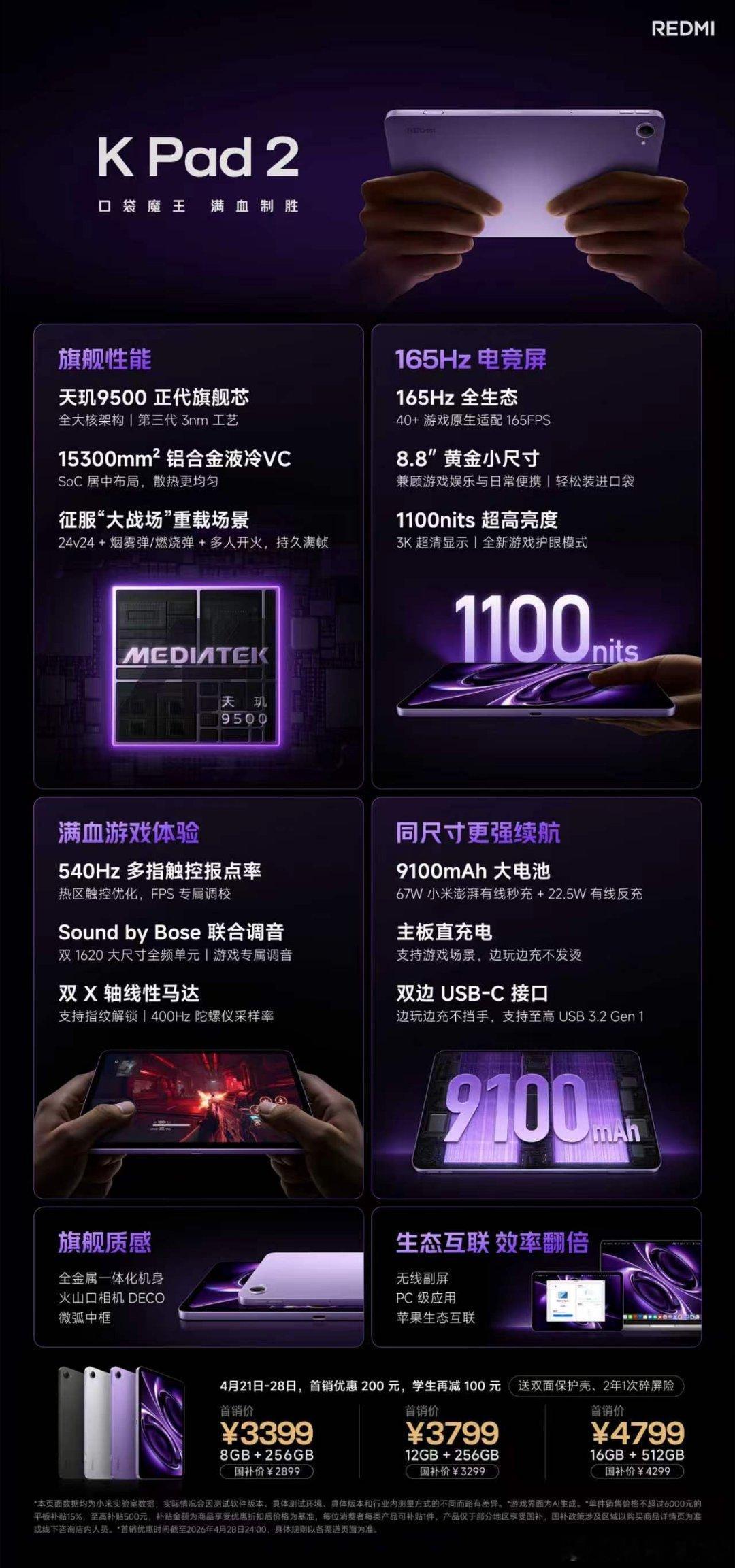 REDMI K Pad 2 现在开售啦首销价 3399 元起!旗舰性能|天玑9500 旗舰芯,15300mm² 散热VC电竞屏幕| 8.8″黄金便携尺寸,165Hz高刷高亮屏超长续航|9100mAh大电池,双边 USB-C 接口满血体验|热区触控优化,游戏专属调音红米给的真的太多了😭REDMI