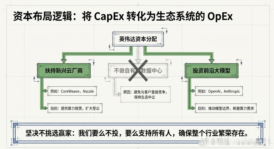 老黄去了Dwarkesh Patel 的播客,网页链接我让notebooklm帮我做的总结有这样一张图是描述Petel问老黄为什么要投资neocloud公司而不是选择自己做,老黄说了两个角度:1、只做必要之事,那种我们不做就没人做的事;2、投资这些neocloud公司也符合这个逻辑,以及策略上是不挑选赢家,要投就都投……