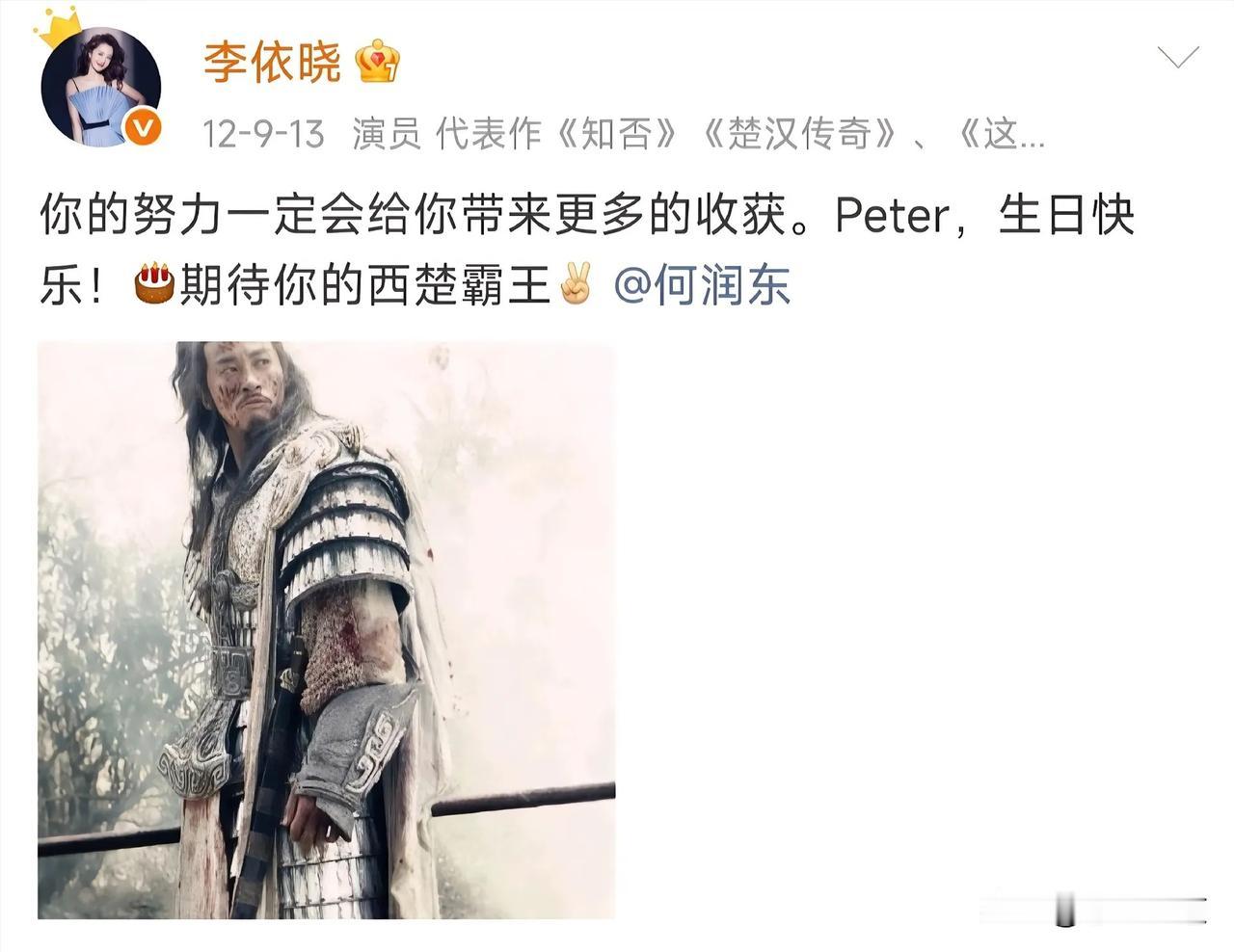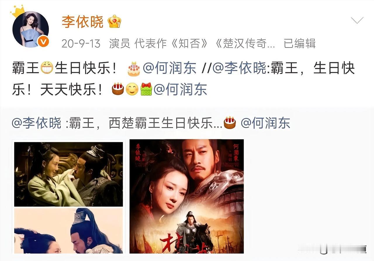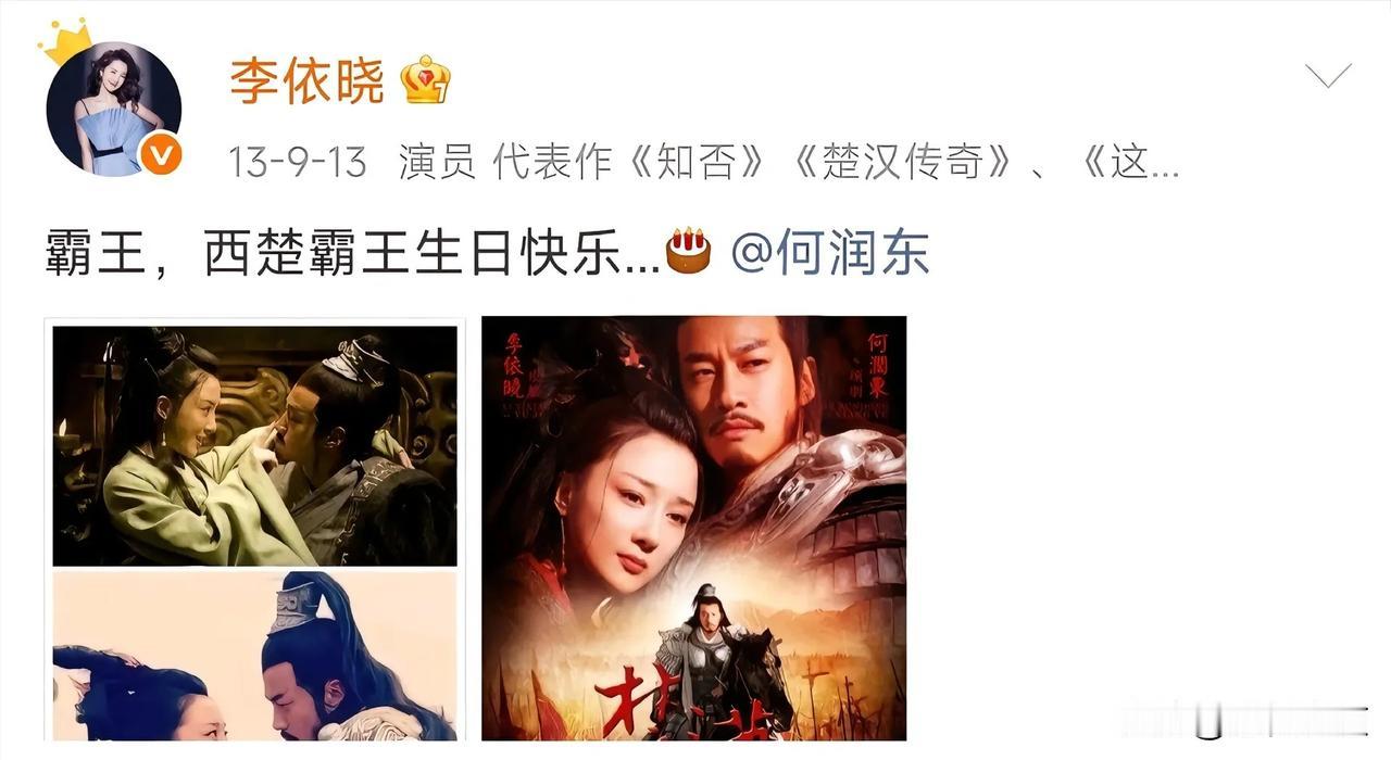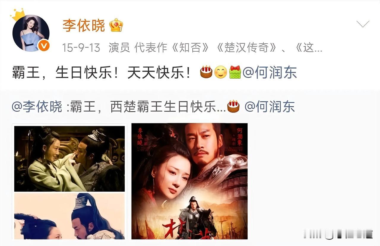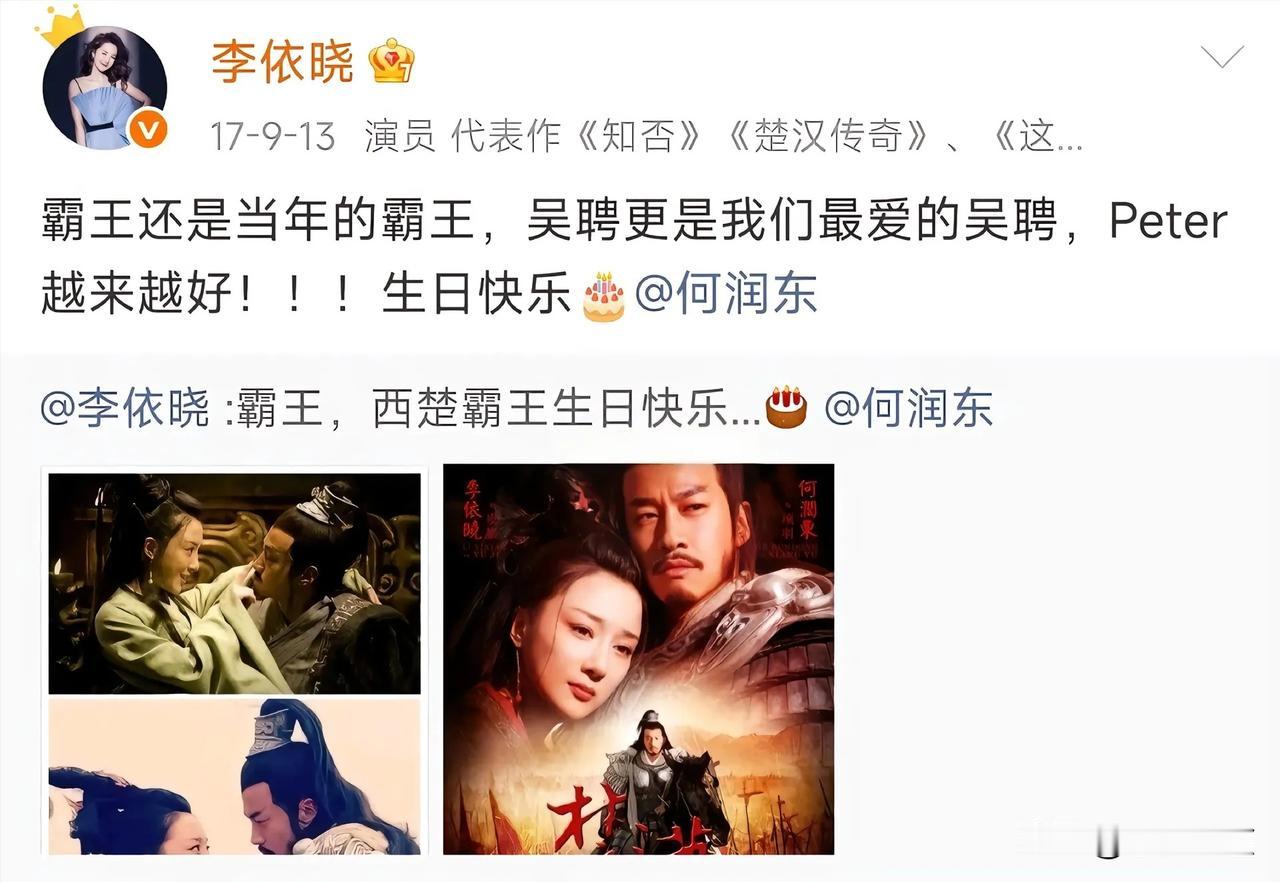 山河依旧,岁月匆匆,剧集落幕多年,世间再无楚汉之争,可虞姬的心意,却跨越十余载,年年如约而至。很少有人留意到,每年何润东生日这天,李依晓总会准时送上祝福,安静发文,浅浅寄语,一句简单的“霸王,生日快乐”,温柔又郑重,一坚持,便是十几年。