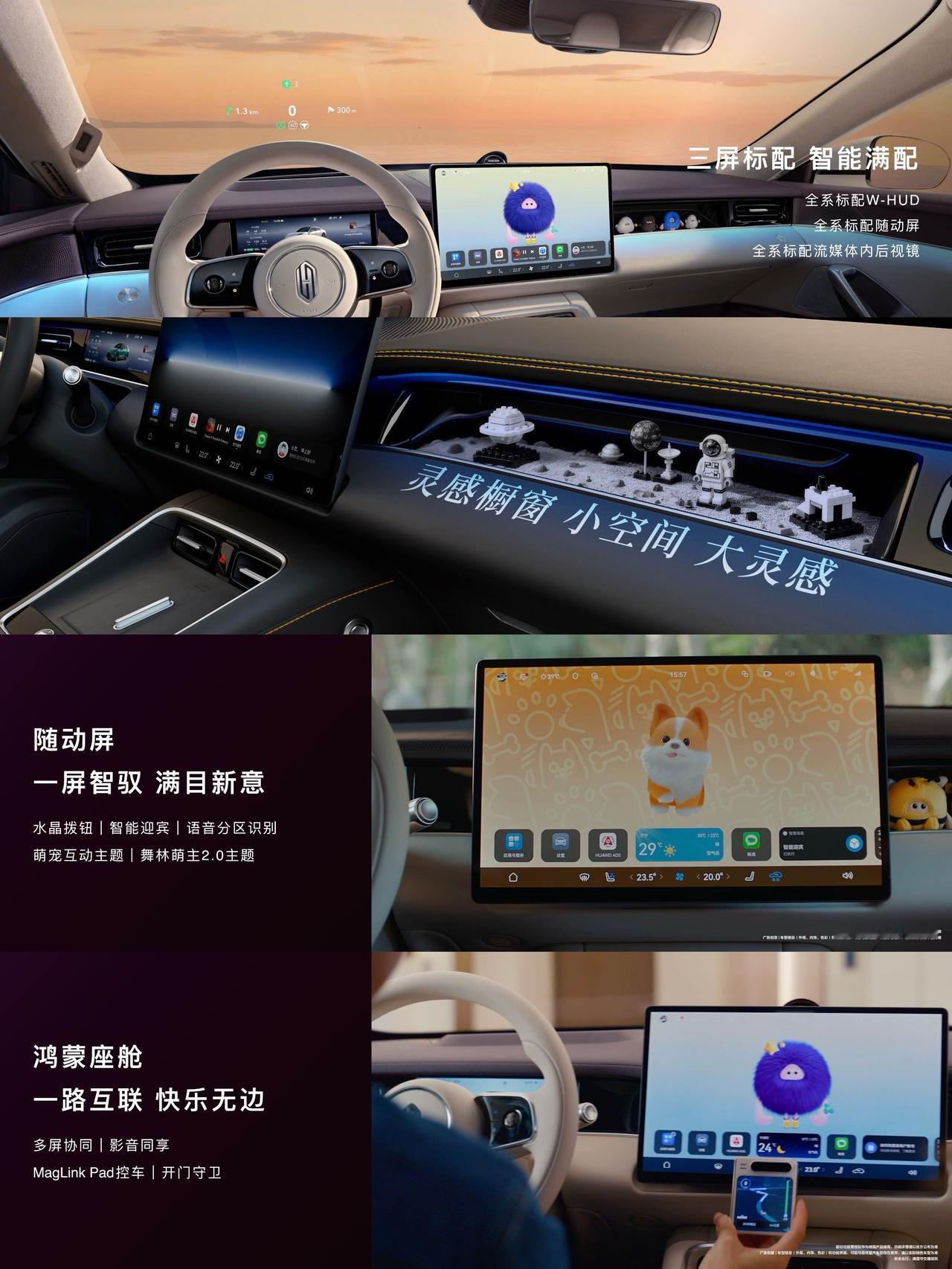 内饰提供5款时尚年轻拼色,并配备一体式运动座椅。座舱内拥有仪表盘、大尺寸悬浮中控屏、副驾屏,并首发“随动四维屏”(支持前后伸缩与左右自动转向迎宾),深度融合华为鸿蒙智能生态。