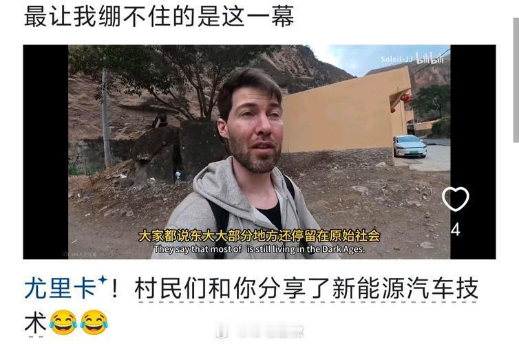 这美国博主真是睁眼说瞎话,原始社会有新能源汽车是吧?看来大凉山的孩子们还没给他上