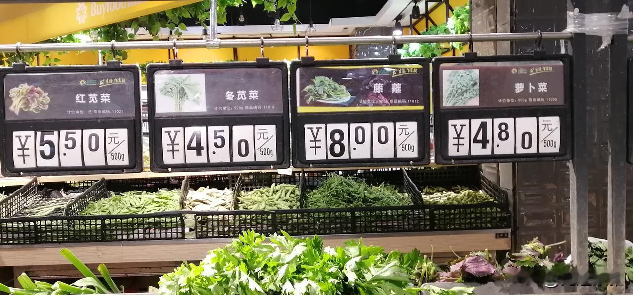 今天去超市买菜,发现,红薯叶子每斤6.50元,小白菜5.50元,南瓜藤4.90元,红苋菜5.50元,藤蕹8.00元……。