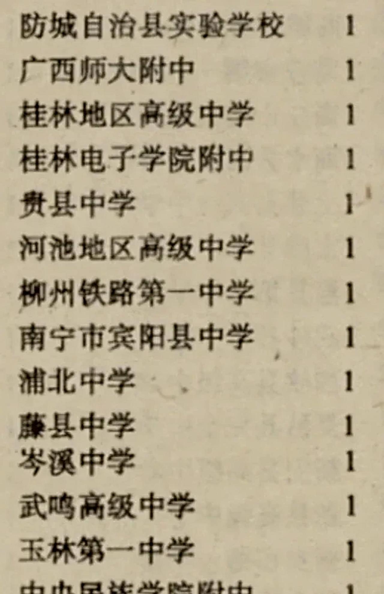 1987年清华大学在广西录取43人,分布在23所中学,柳州高级中学、南宁二中、桂林中学考上的人数最多。 其实广西高中一直都是南宁、柳州、桂林的最强,老传统了。当年玉林这边的高中还不是很强,现在就很厉害了,像玉林高中已经进入前列了。