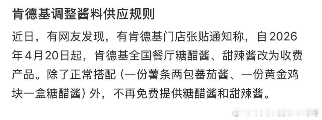 肯德基糖醋酱、甜辣酱改收费了,1.2元一个!最近,有网友发现多家肯德基门店