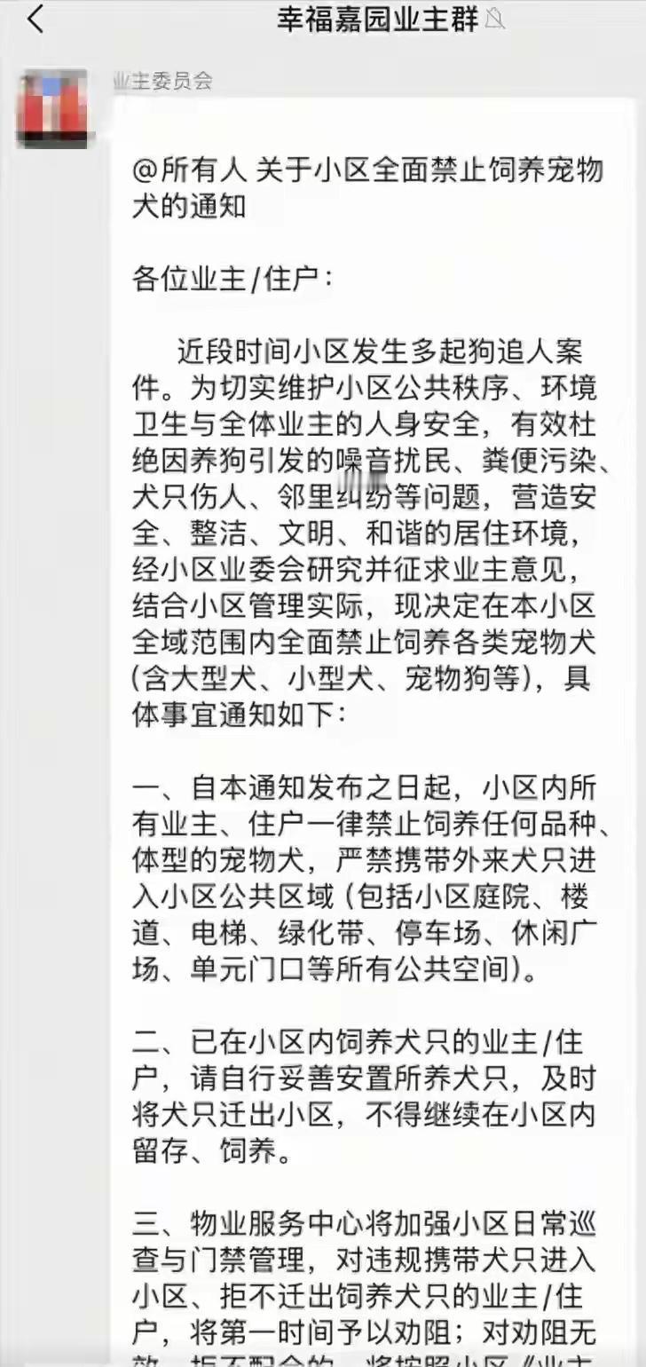 近日,广西南宁黎塘镇幸福嘉园小区业委会一纸 “全面禁养宠物犬” 的通知,在业主群和网络上炸锅。通知称,小区近期多次发生狗追人事件,业委会决定:禁止外界犬只进入,小区内现有犬只必须全部迁出,不得继续饲养。物业将配合管理,拒不配合者将按业主公约处理,并上报社区与公安。