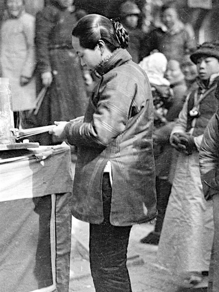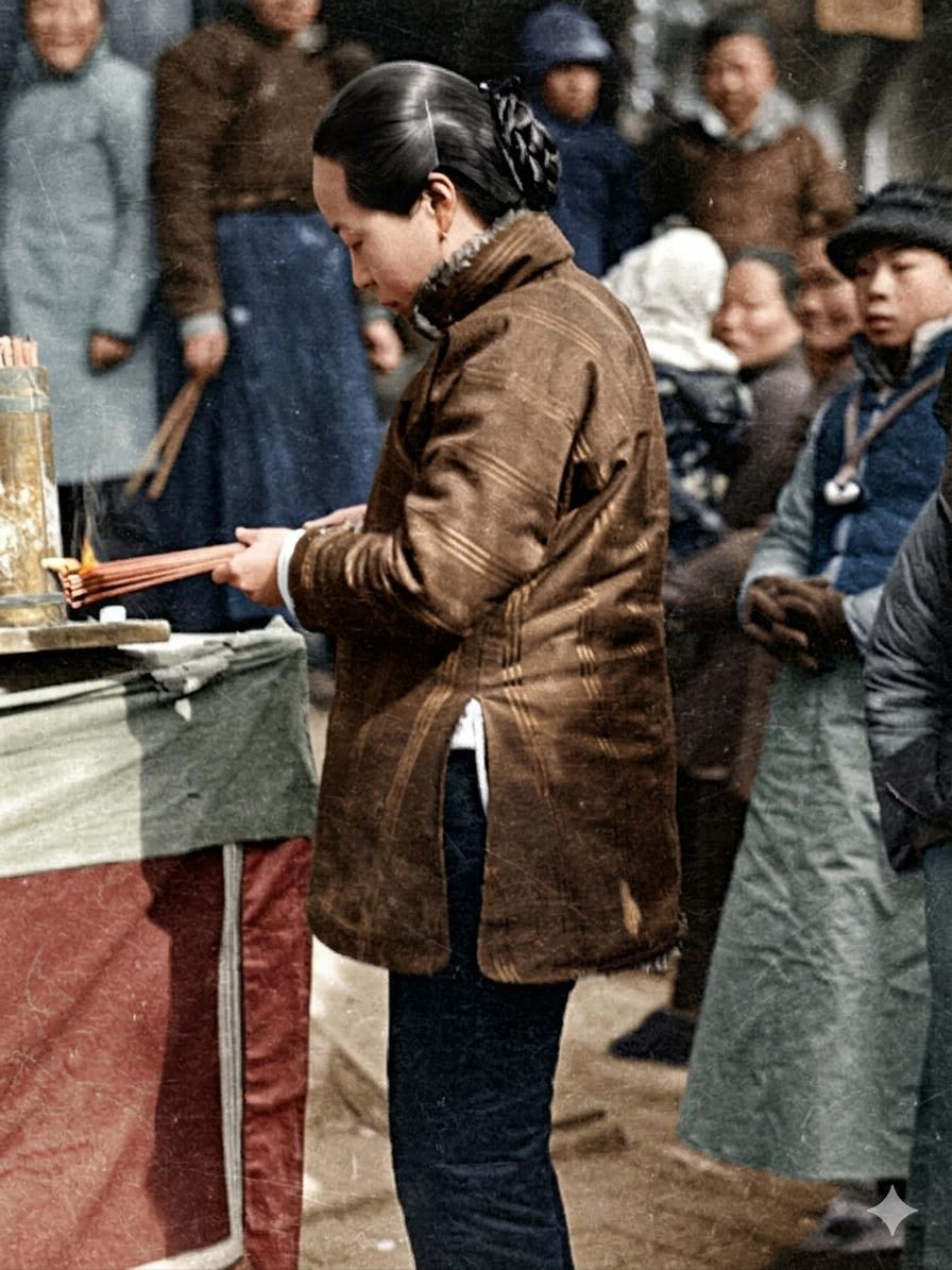 民国庙宇,拥挤喧闹的人群中,一位少妇伫立在供桌前,垂首整理香烛,神情肃穆而虔诚。