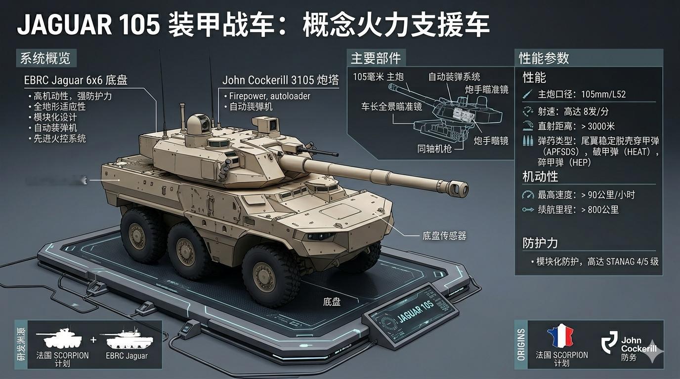 军事ai新视野 据说法国🇫🇷和比利时🇧🇪联合研发的Jaguar 105火力支援车(图1)将在今年的“欧洲萨托里防务展”Eurosatory 2026上亮相。