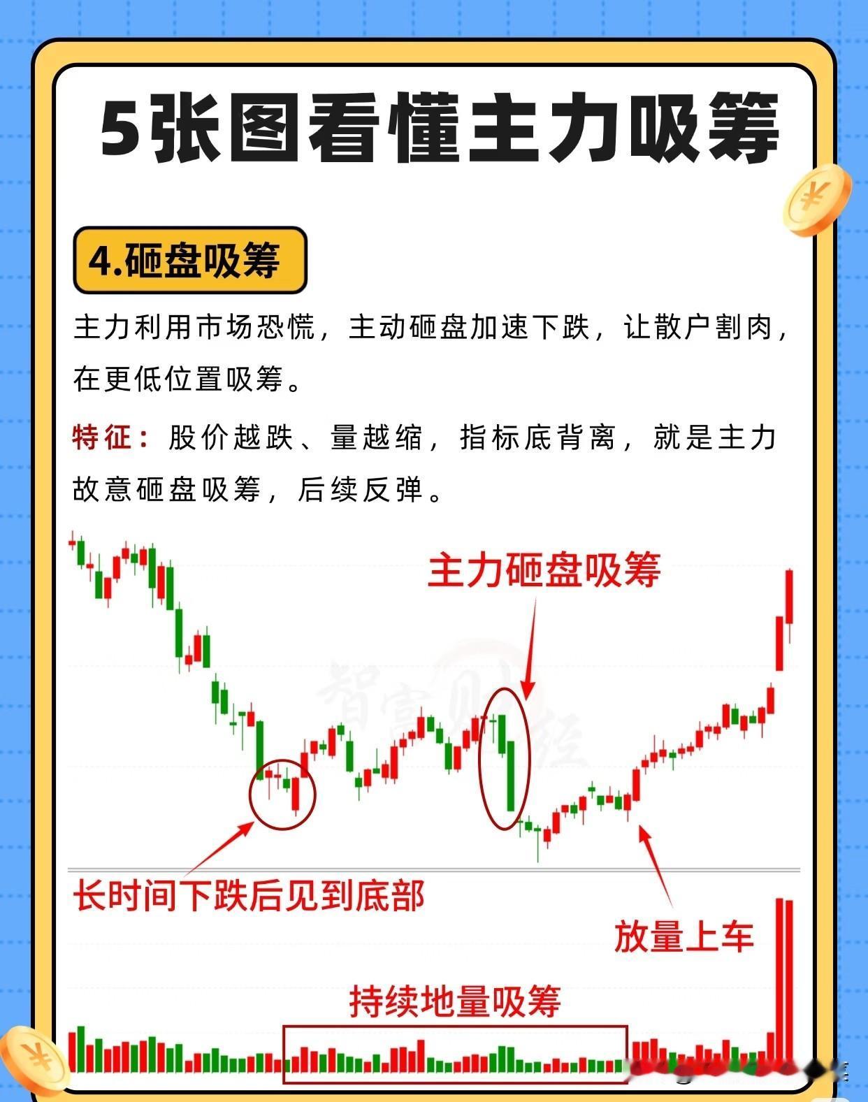 主力吸筹的核心,永远是和散户的心理博弈。最温和的是低位温和吸筹:股价跌透后小步抬升,震荡缩小、底部悄悄抬高,成交量温和放大,筹码在无声无息中向低位集中,就像猎人在猎物放松警惕时悄悄靠近。这种模式最隐蔽,却也是后续行情最稳的信号。