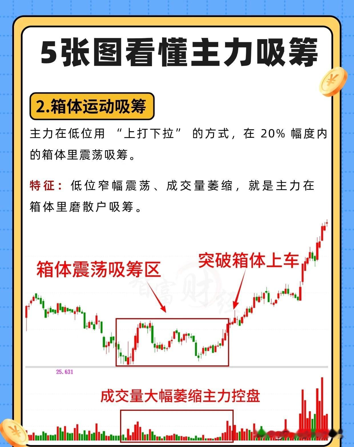 更常见的是箱体运动吸筹:主力用“上打下拉”的方式,把股价困在20%的窄幅箱体里反复震荡,成交量大幅萎缩,磨掉散户的耐心。很多人熬不住离场,筹码就悄悄流进了主力口袋,等突破箱体时,才发现自己卖在了启动前。