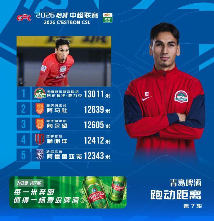 中超第7轮,跑动榜上河南小将阿布拉汗跑了13011米,位列第一!