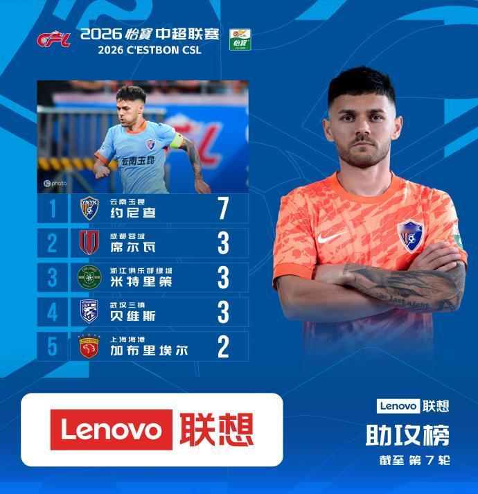 在助攻榜上,约尼查7次位列第一;蓉城的韦灵顿-席尔瓦有三次助攻,他也以5球3助变成了中超最具有攻击力的球员。