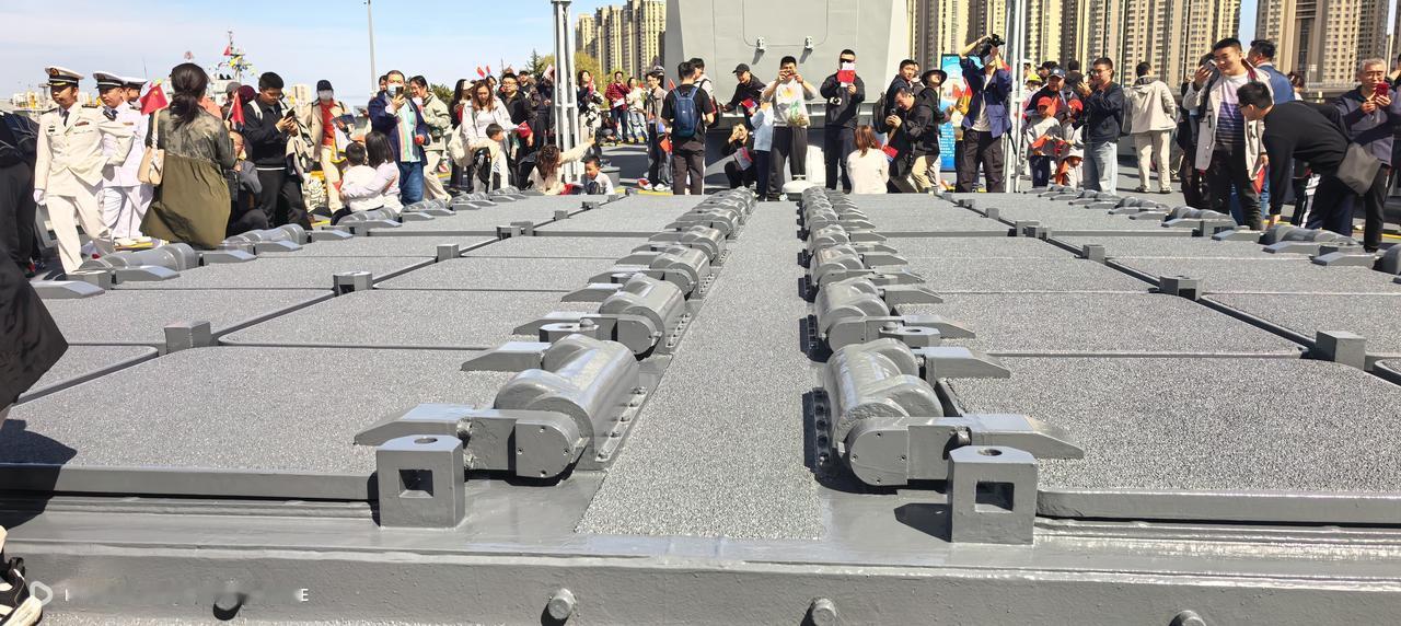 052D上的850大垂发,表面是类似于飞行甲板的粗糙材质,灰色防滑耐磨涂层。052D共有64单元垂发,按现场解说给的数据通常带16反舰和48防空。