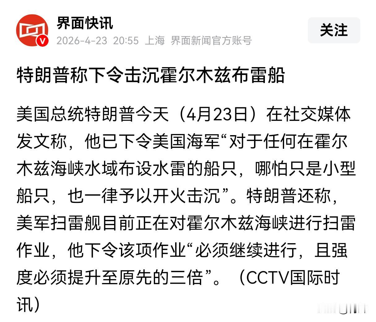 伊朗希望美国再等等,特朗普已经下令击沉霍尔木兹海峡布雷船 截止到4月23号,美国